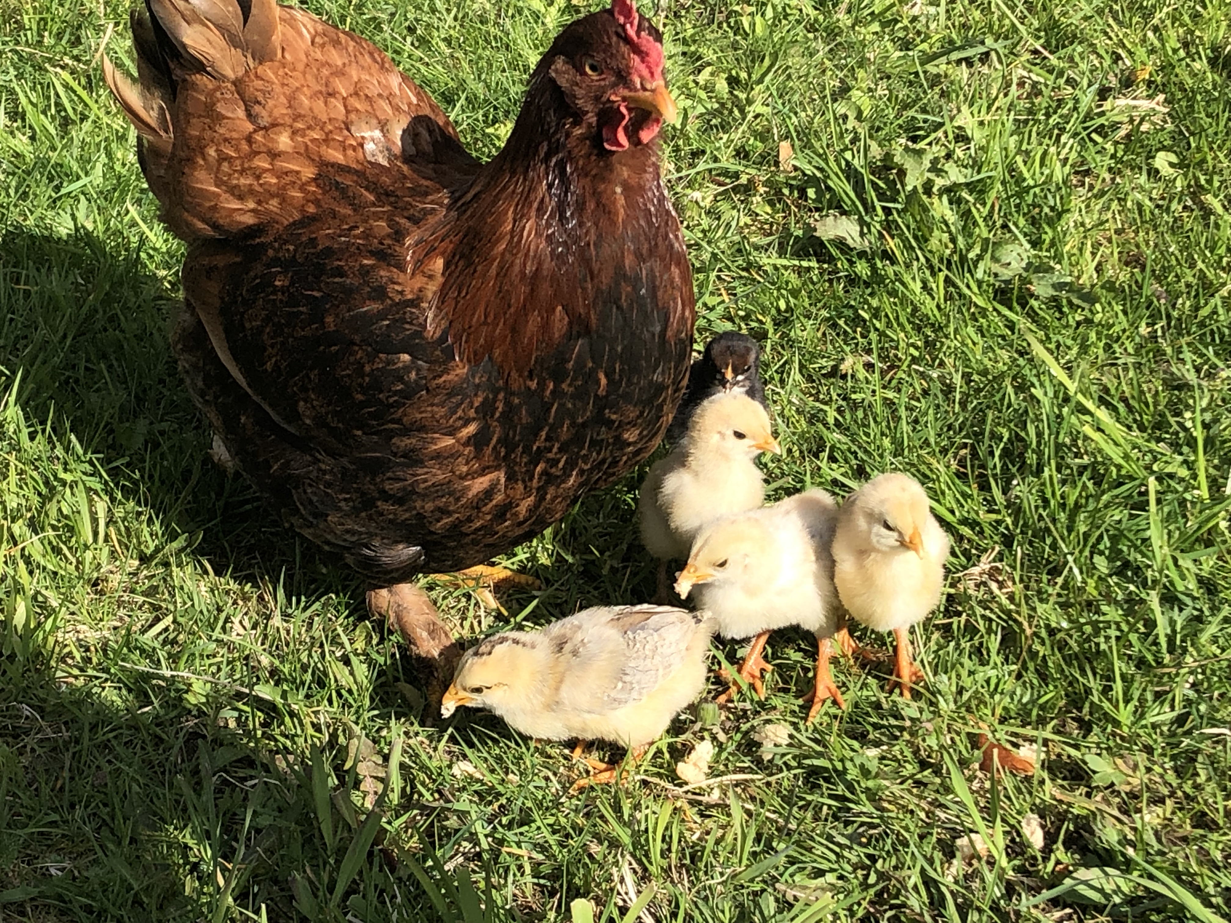 Och så gick vi ut såklart. Brons som för tillfället bor i en halmhög i ladan var redan ute med sina kycklingar.