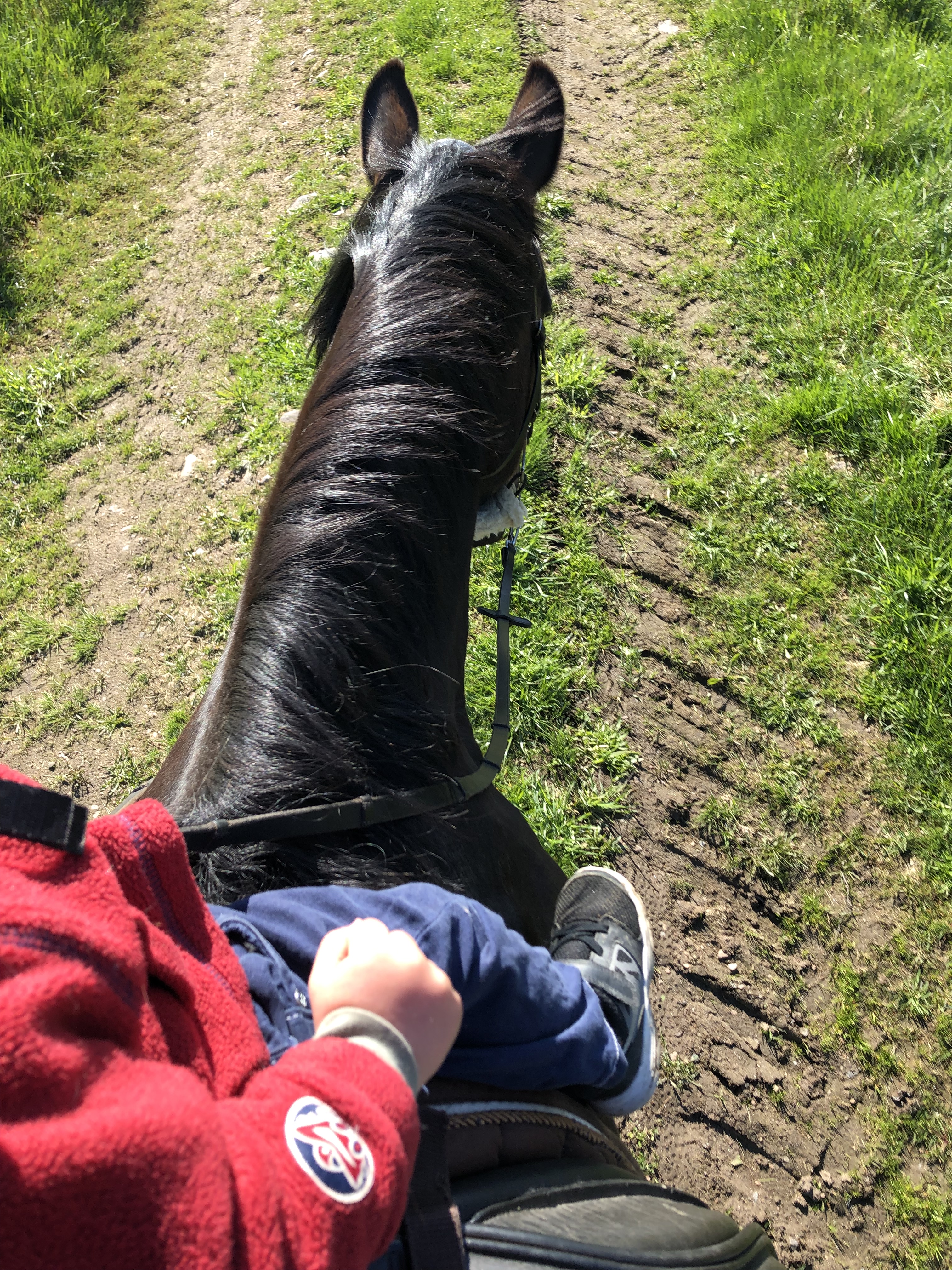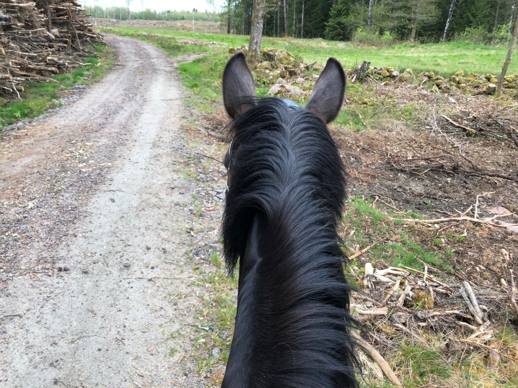 Jag slängde upp barnet och kravlade efter, inte hur smidigt som helst men det gick! Och så fick Loke hänga med på sin första uteritt! Lång var den också, säkert en dryg kilometer. Genom skogen, över gärdet och tillbaka. Vi tyckte det var roligt båda två!