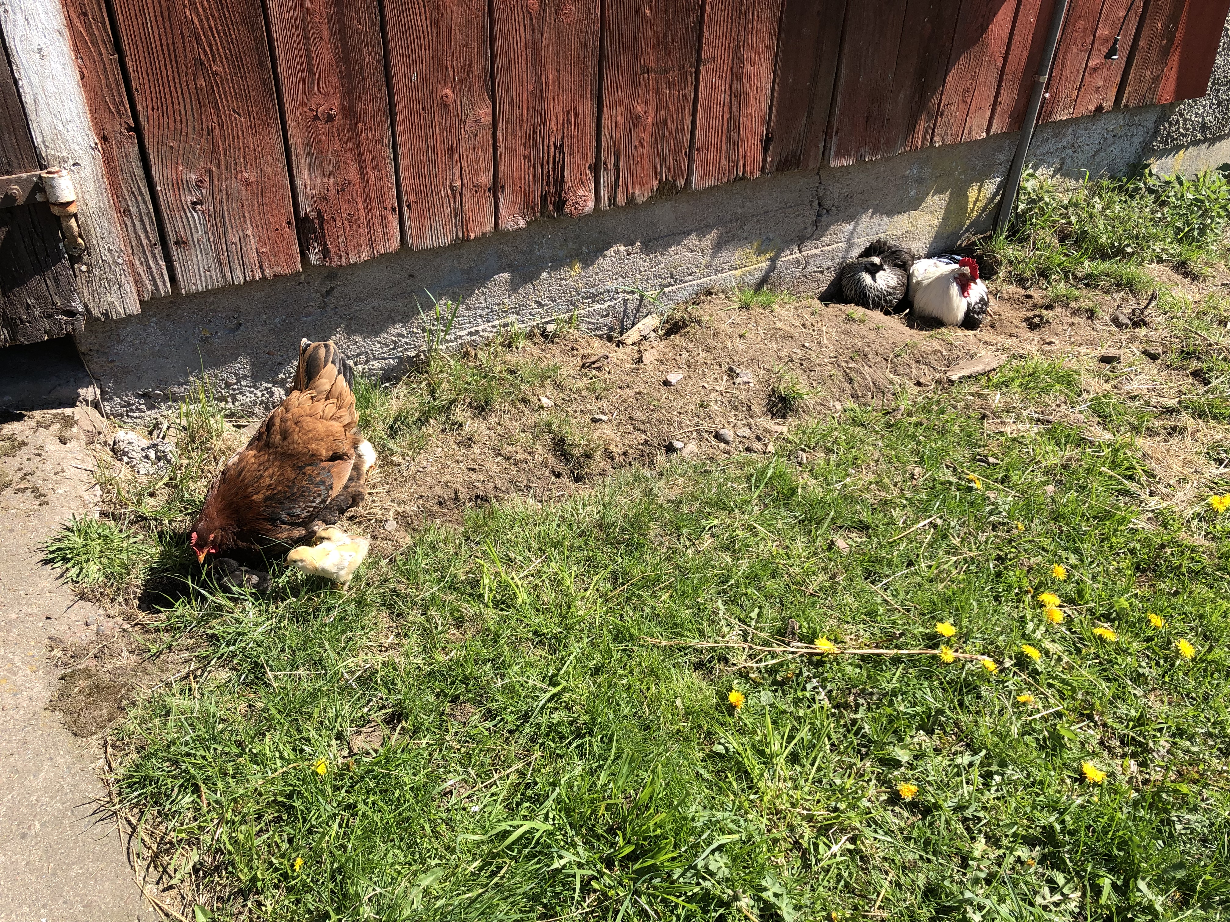 Sen blev det lunch, Loke sov middag i vagnen, jag lasttränade Kaprifol och kikade på kycklingarna. Kan inte se mig mätt på dem när de går omkring och pickar i marken. Här syns Titan och Silver också, som gottar sig i solen.