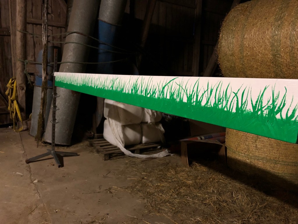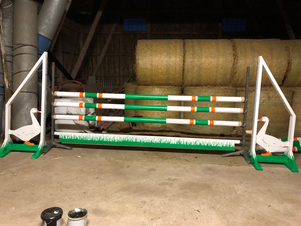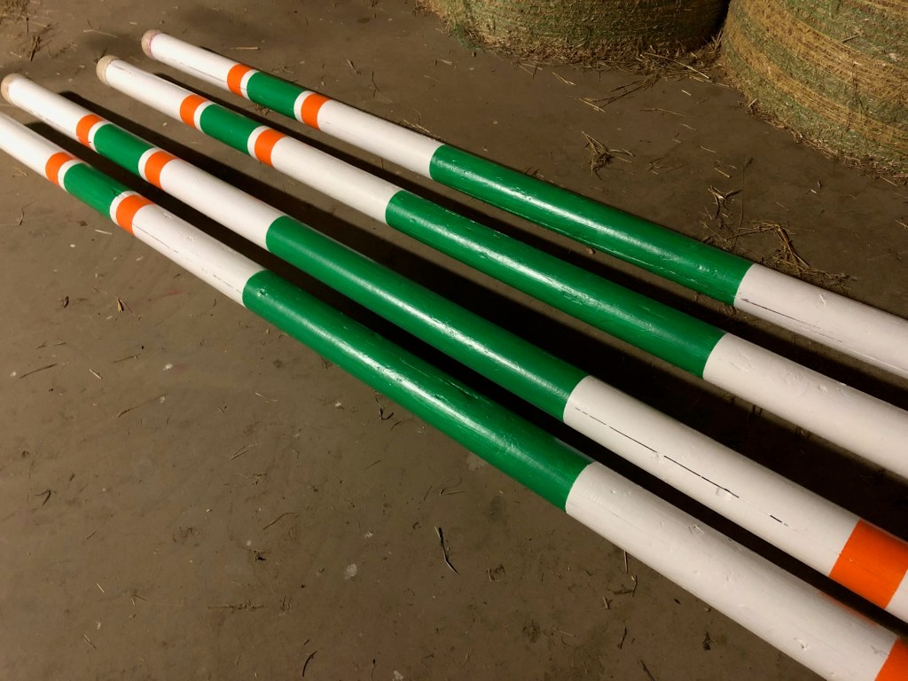 Sen var det dags att färglägga! Även färgen har vi hämtat i Gäsene, det fanns kvar sen tidigare hinderbygge. Grönt, vitt och orange på bommarna!