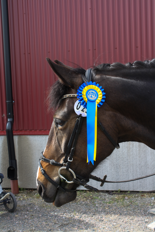 Jag är jättenöjd med dagens tävling, på alla sätt faktiskt. Kaprifol var lite mer nervös i stallet och vid lastning denna gång, hon visste väl vad som väntade! Men hon gick ändå fint in i släpet och jag kunde stänga bakom henne själv, efter en eller två gångers försök. Resan rullade på fint, mamma körde sin egen bild dit så hon kunde åka hem efteråt, och Loke somnade och sov hela vägen. På plats i Vara, efter ca 40 min körning, parkerade vi och även pappa var där då! Så jag lämnade häst och barn i mina föräldrars händer och gick och visade vaccinationspappren och gick banan. Jag startade som ca nr trettio och tävlingen gick ganska långsamt, men Kaprifol fick snart komma ut och gå runt och titta lite. Hon var lite otålig inne i släpet men skötte sig fint när hon väl kommit ut och kunde stå ganska still vid sadling efter att ha promenerat runt lite.
