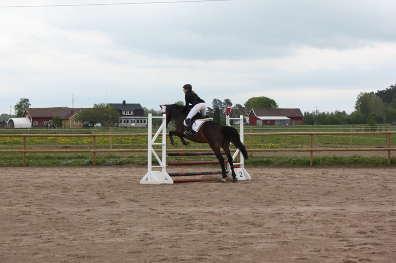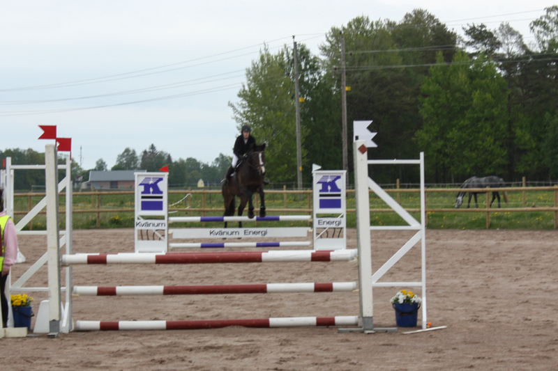 Framridning och framhoppning gick helt okej. Kaprifol var lite spänd och tittig och gick lite med handbromsen i och stannade på räcket en gång, men hoppade bra på oxern då jag red ordentligt, hehe. Så var det dags! Jag visade Kaprifol första hindret och skrittade/travade ett varv runt banan för att kika på eventuell läskig publik och häst i hage, men det var ingen större fara. När jag fick startsignal satte jag lite fart och handbromsen släppte lite faktiskt. Rundan blev helt okej! Jag tycker att jag red okej på alla hinder, kanske lite överilat på vissa ställen för jag ville hellre ha en rivning än ett stop, men vi kom runt felfritt! Jag har inga actionbilder att visa idag, pappa fotade lite så det kanske dyker upp nåt senare!