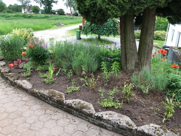 Vi klurade lite på vad vi skulle fylla rabatten med nu i stället när det blev så mycket tomma ytor. Och vi bestämde faktiskt att vi plockar lite växter från rabatten från andra sidan och sen helt enkelt ta bort den rabatten. Den är inte vacker, till stor del för att vi inte tar hand om den så bra.