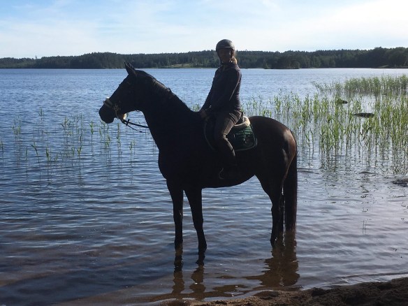 Sen gick vi rundan via badplatsen, jag på hästen och Loke i vagnen.
