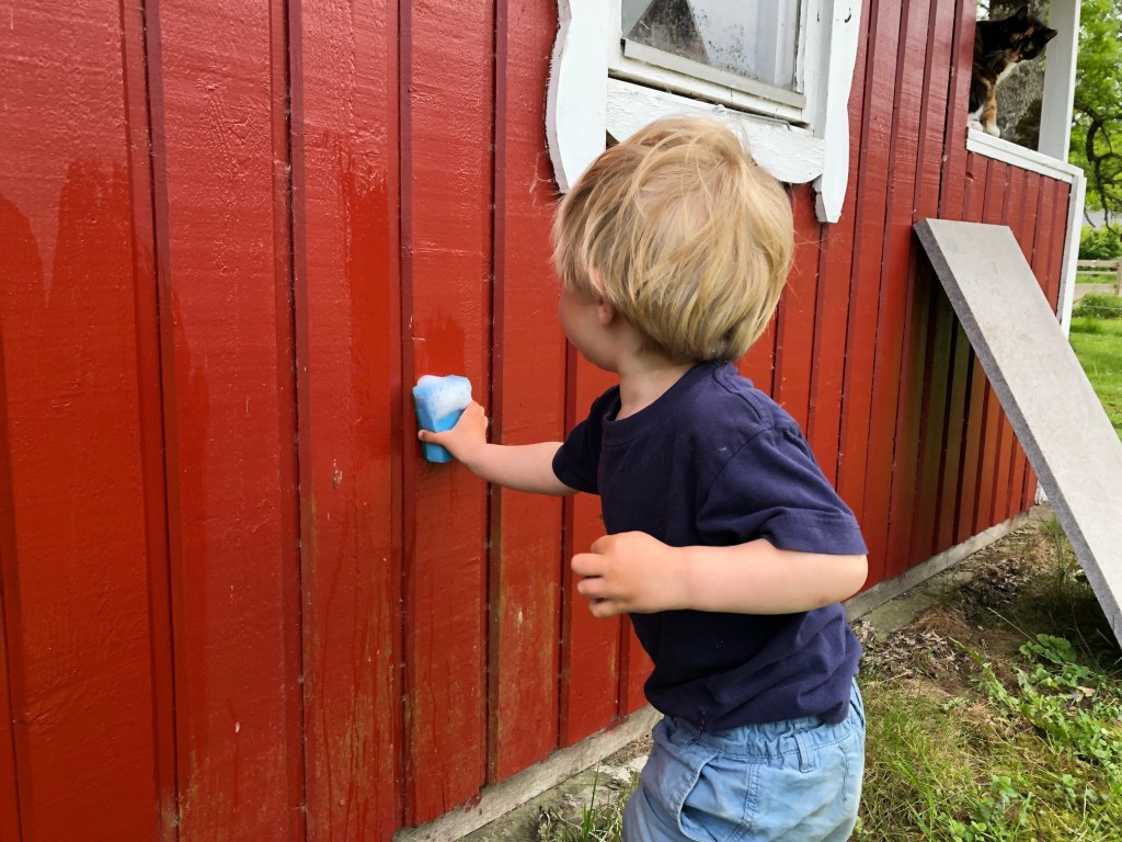 Vatten är ju roligt i alla dess former. I söndags eftermiddag hjälpte Loke gärna till att tvätta bort lite algväxt på lekstugan. Den röda färgen är i övrigt ganska fräsch, det vita behöver dock skrapas och målas så det blir väl ett av sommarens mindre projekt.