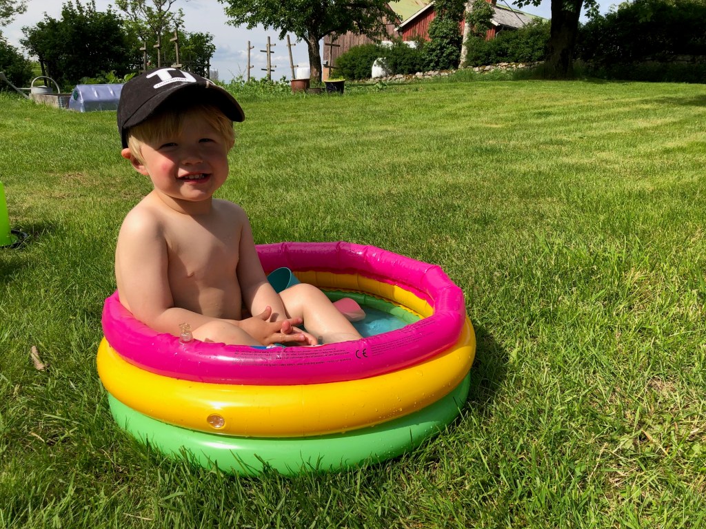 Sen åkte vi hem, åt lunch och jag tänkte att Loke skulle sova middag men det tänkte inte han. Han måste ha slumrat någon minut i bilen på vägen hem från Rebecka för det blev helt enkelt ingen middagslur. Men vädret var fint så vi gick ut och lekte med vatten i sandlådan, och så kom lilla poolen fram också. Nästa 25 grader var det ute!