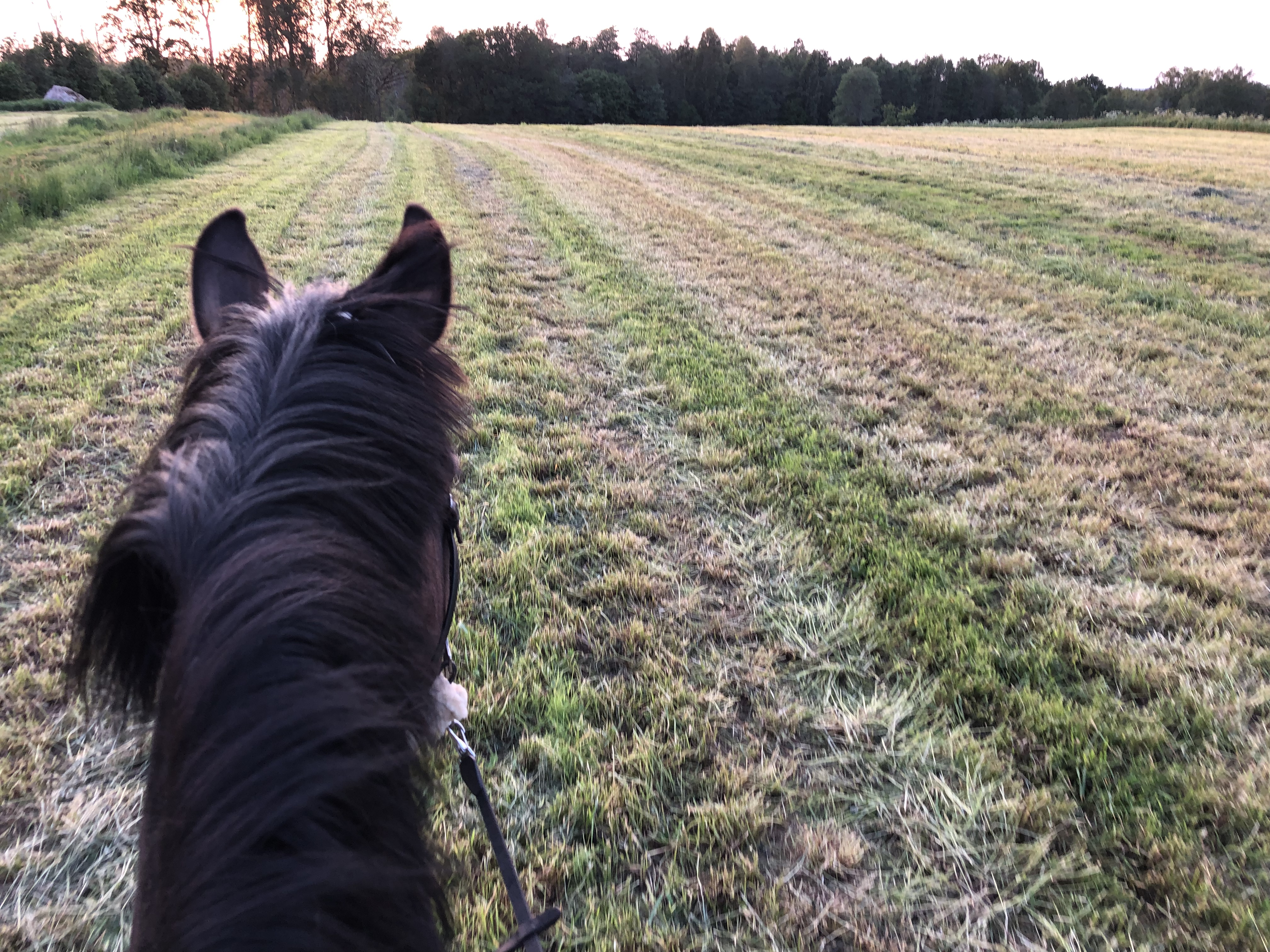 Jag kom på att det är ju här jag ska fortsätta träningen med den förvända galoppen! Stora, öppna ytor och lite extra framåtbjudning! Under senaste dressyrträning gick det ju lite framåt och det känns som att poletten håller på att trilla ner. Man KAN gå i ”fel” galopp, man måste inte byta på momangen. Jag red stora stora S-bågar och överdrev berömmet nåt ofantligt när hon höll galoppen och gjorde det enkelt för henne att förstå vad jag menade. Efter ett par bågar kunde jag rida en stor halvcirkel i förvänd galopp i båda galopperna och det gick jättebra. Så roligt! Och det är ju grymt bra arbete, så fin och lösgjord har hon nog aldrig varit i galopp på ett gärde förut, hehe. Jag avslutade med att galoppera lite lugnt i rätt galopp och kunde ha henne riktigt rund och fin, på nästan lite halvlånga tyglar. Så självbärande och balanserad och fin! Nästa pass blir nog också där ute!