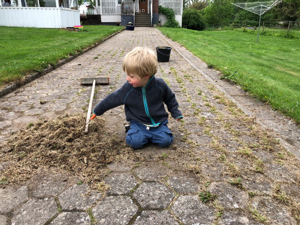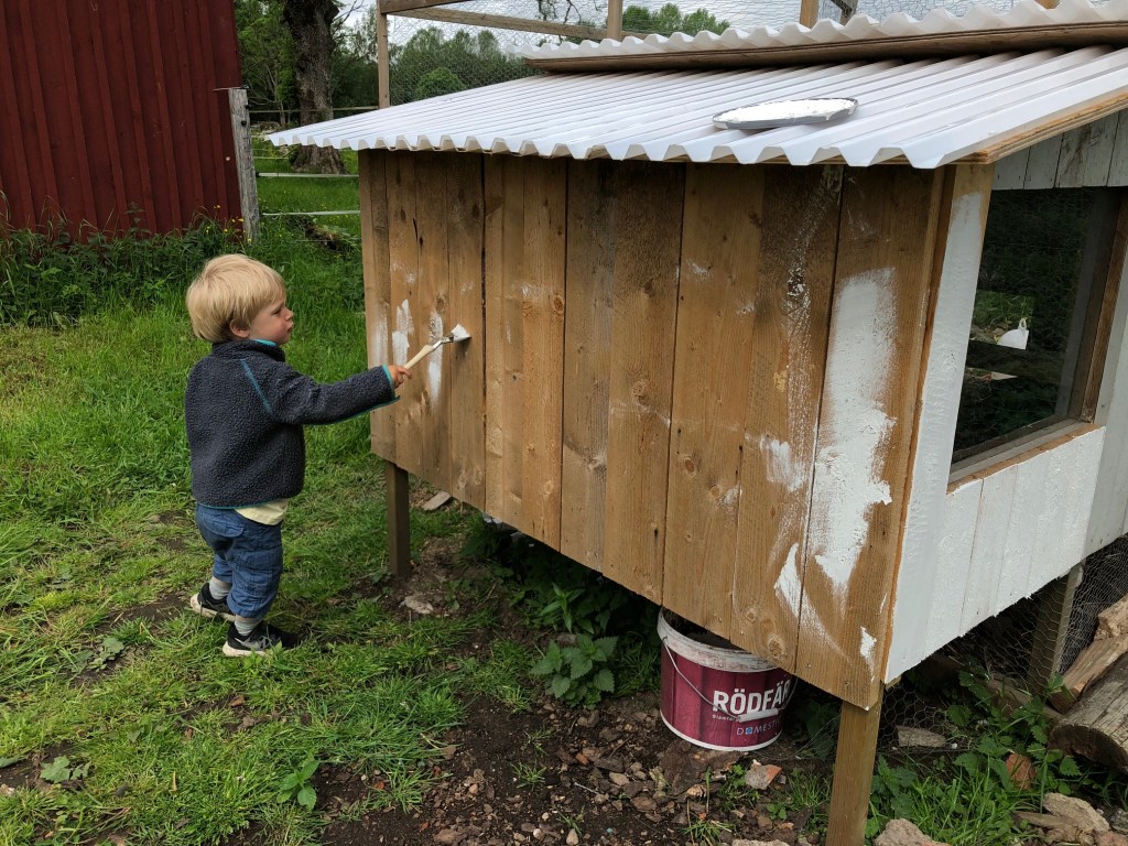 Medan jag målade lister var Axel och Loke ute och drog upp brännässlor i hönsgården. Ogilla på dessa växter! Lite ogräsrensning följde och Loke växlade med att hjälpa till och leka för sig själv.