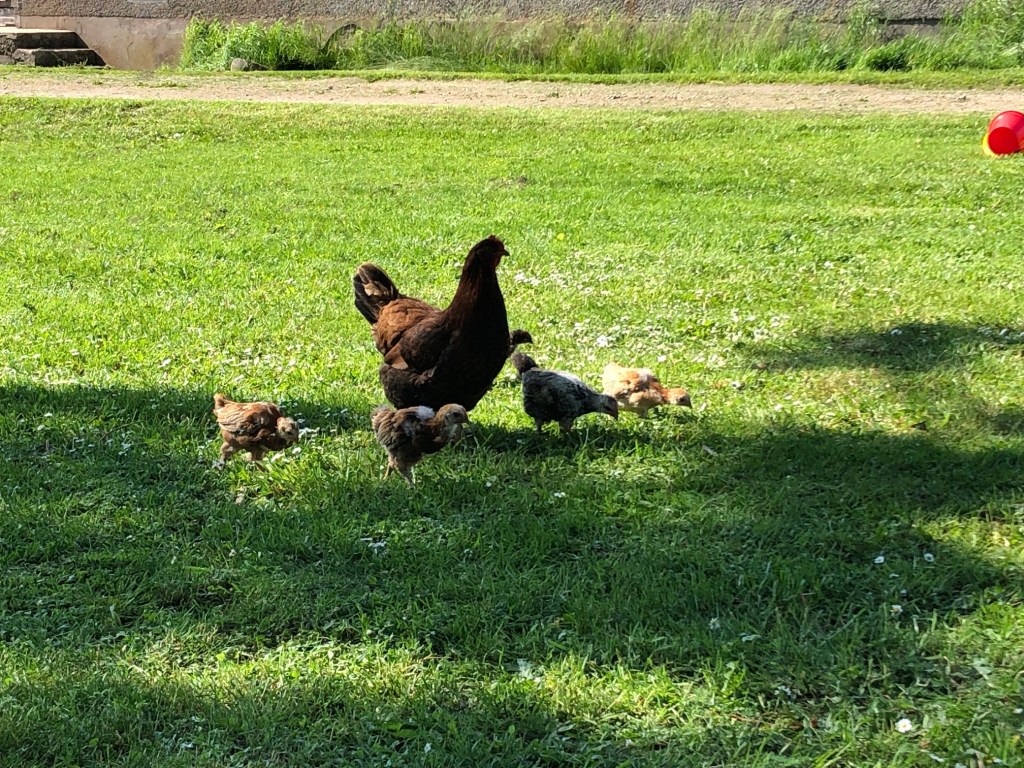 Fru Brons och femlingarna, som högst troligt är tre tuppar och två hönor! Tråkigt nog är båda hönorna bruna, är ju roligast med olika färger, men de kanske utvecklar sig åt lite olika håll så småningom. Hönorna kommer vi behålla och tupparna kommer vi sälja eller äta upp.
