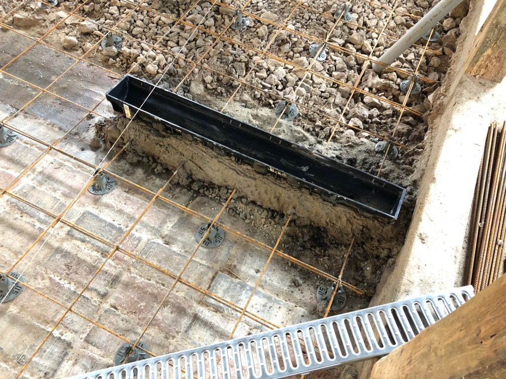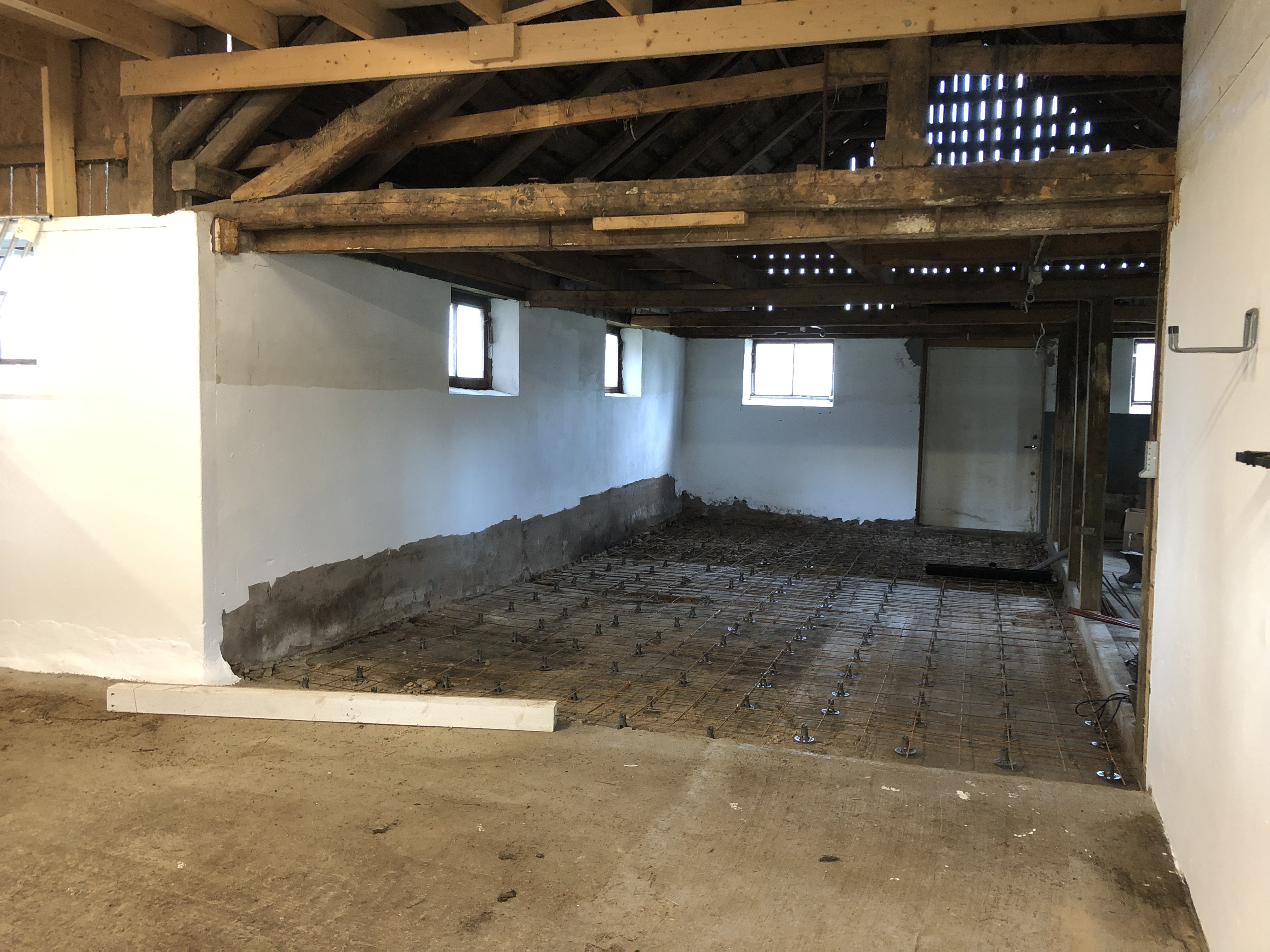 Förutom att laga betesputsen (igen) har Axel fixat det sista i verkstan inför gjutning, nämligen gjutit fast avloppet så det står still när betongen till golvet kommer in. Lite grus från lösdriften som ska grävas om, och överbliven cement från jobbet!