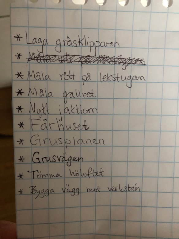 I morgon jobbar Axel sin sista dag innan semestern och då är det ju hög tid att planera den! Förutom några korta turer och besök är det arbetsläger som gäller såklart! Vi skrev en liten ”önskelista” på projekt häromdagen och den ser ut så här.