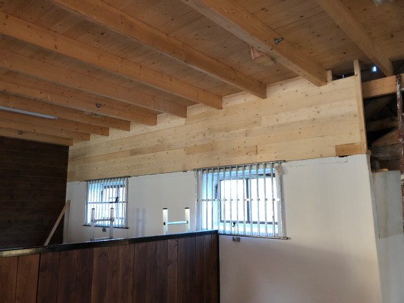 Det saknas en bräda som ni ser, men Axel tänkte att det nog kan vara bra att komma åt där när nästa del av väggen ska panelas. Det blir nämligen som ett trappsteg in där, innan väggen sen går mot sadelkammaren. Men det ligger ju lite i framtiden. Betonggolvet blir gjutet först nästa vecka så det bygget ligger lite på is nu. Vi ser i stället fram emot att grävar-Martin kommer på fredag!