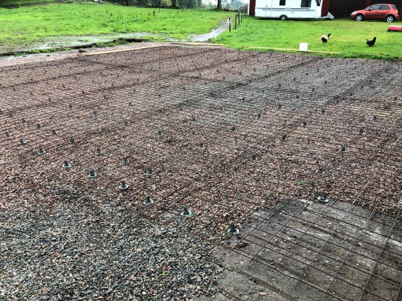 Stallets blivande betongplatta är i alla fall nu redo för gjutning. Distanser är satta, en ram av brädor är byggd och lite grus har fyllts på där det fattades.