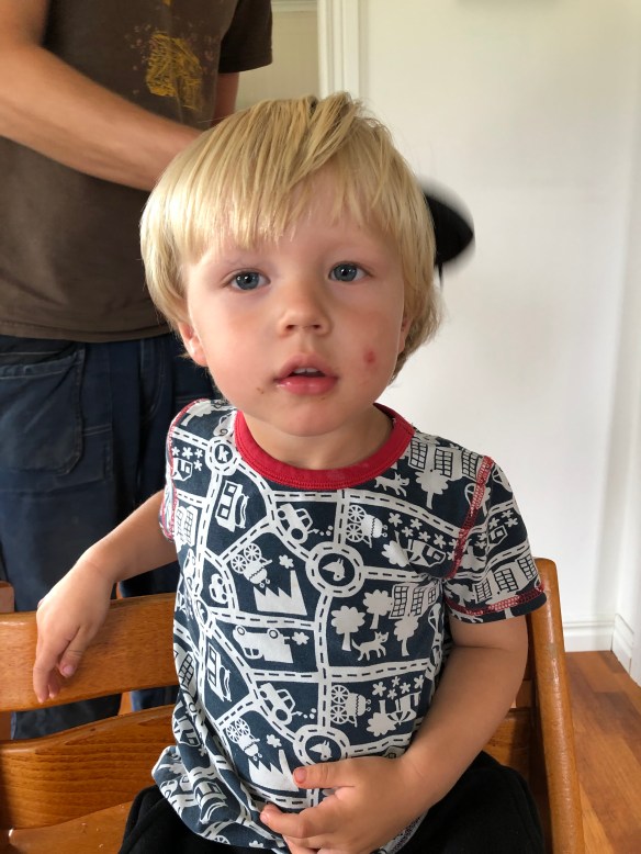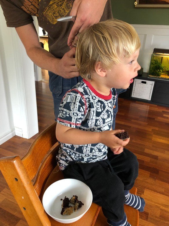 Efter Lokes middagslur, där båda föräldrarna passade på att vila sig också, plockade vi fram saxen och satte den i Lokes hår.