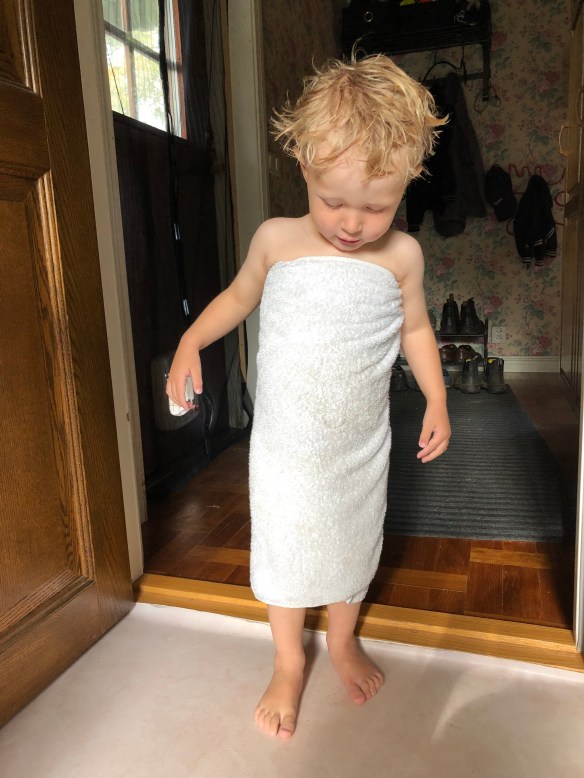 Idag ”hotades” det med enorma regnmängder så vi var förberedda på att ge oss ut en sväng under morgonen innan det drog igång. Loke vill gunga, såklart. Alltid. Varje dag. Hela tiden.