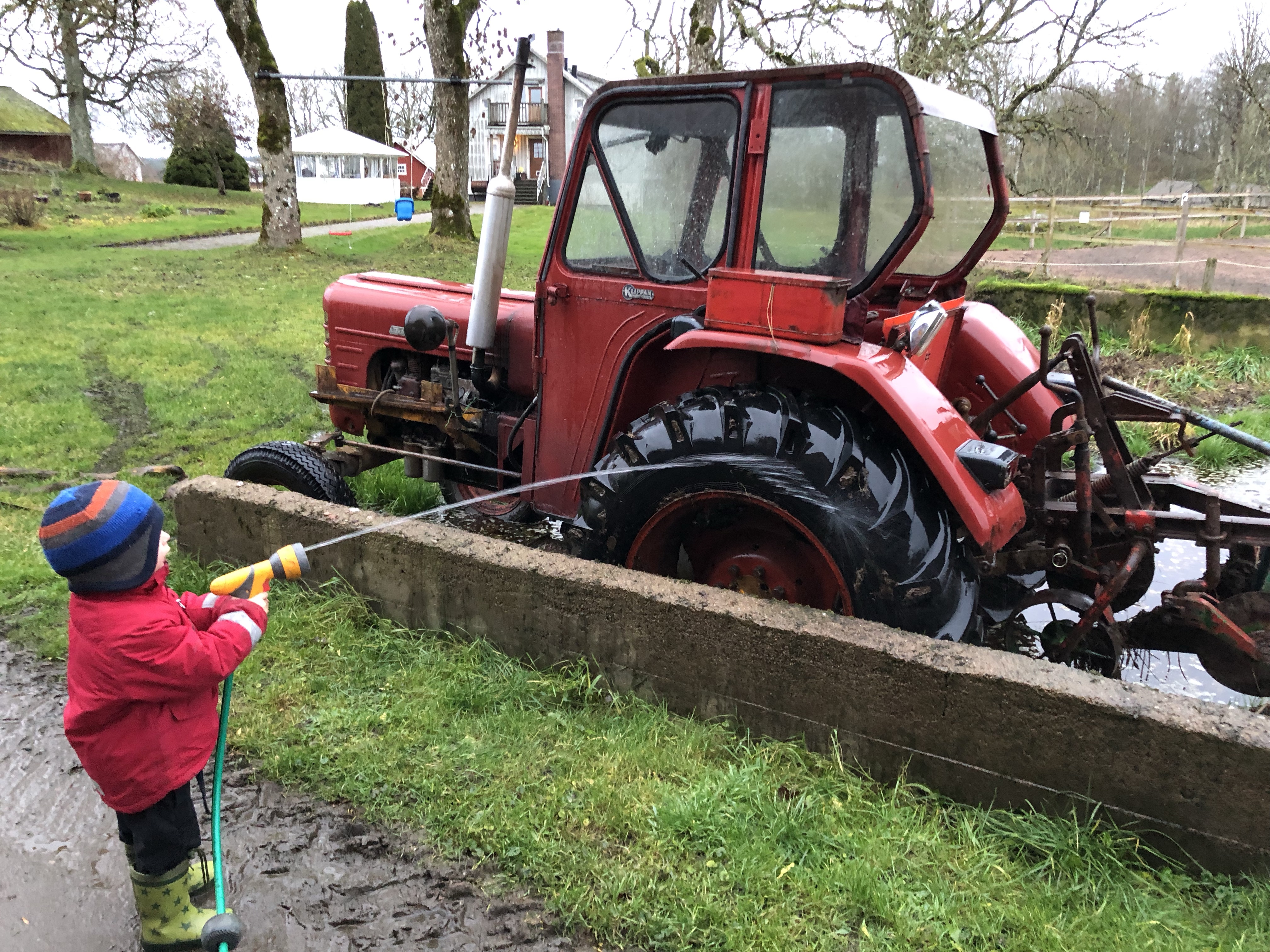 När detta var klart mockade jag lösdriften medan Axel tvättade släpet med högtrycken både invändigt och utvändigt. Det ska inte användas så mycket framöver så tänkte det var bra att tvätta av det. Vi tog även ut mattan för att rengöra golvet ordentligt och tänkte inte lägga in den på några dagar så släpet torkar ordentligt. Vi parkerade det inne i ladan, annars skulle det nog bli svårt med just tork-delen, hehe.