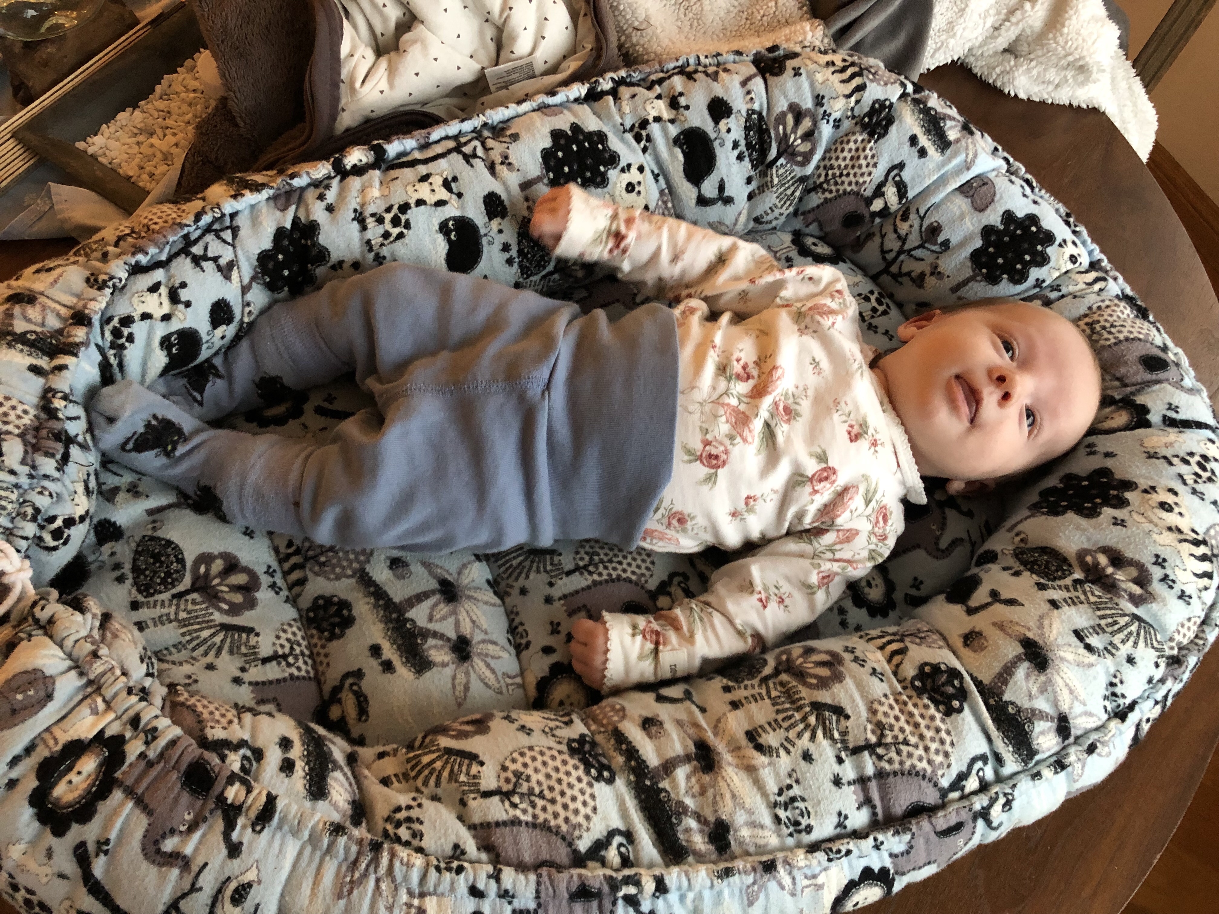När Nora var vaken lite senare gjorde hon sin allra första blöj-översvämning och det blev bebisbajs överallt. Klädbyte!
