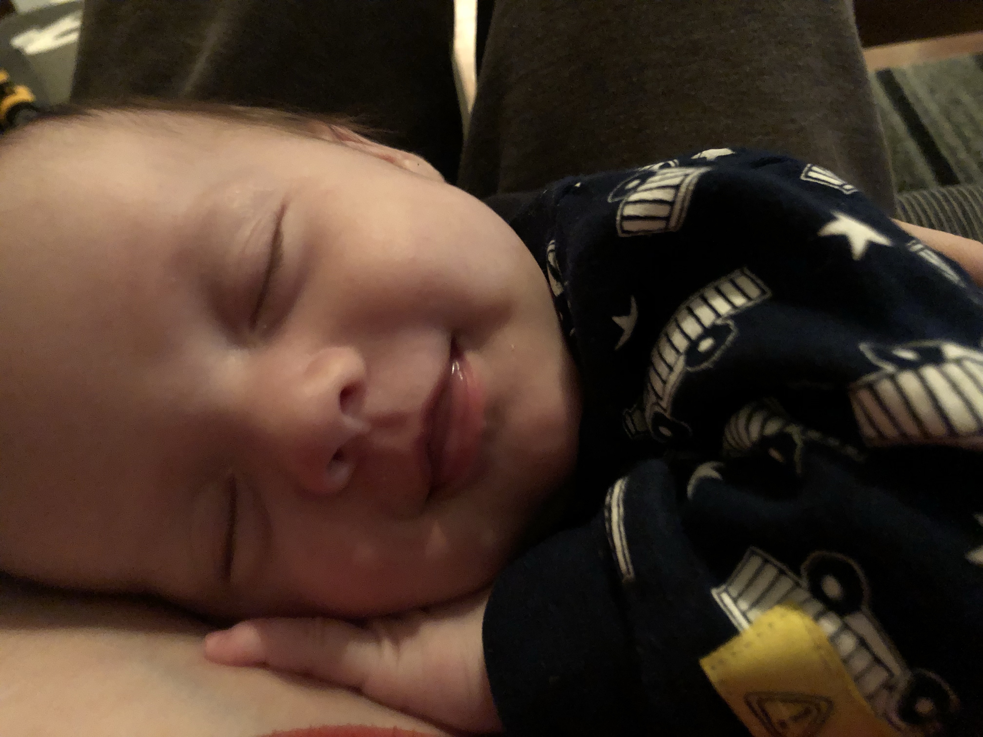 Vi var ute ända tills det blev dags att äta lunch och direkt efter denna gick vi ut igen, nu med båda barnen i vagnen. Tanken var såklart att Loke skulle sova middag men efter en timmes puttande på den där vagnen och bara ett sovande barn gav jag upp och gick hem. Vi satt då i soffan en stund och tittade lite på tv och så blev det middagsförberedelser också. Och så lastade vi ”höbalar” i kärran också, det är favoritleken just nu. Några minuter innan Axel kom hem ammade jag Nora i soffan och Loke kröp upp intill och somnade, bara sådär liksom. Gullungen. Han hade klarat eftermiddagen över förväntan ändå, med missad lunchlur och lite hängig.
