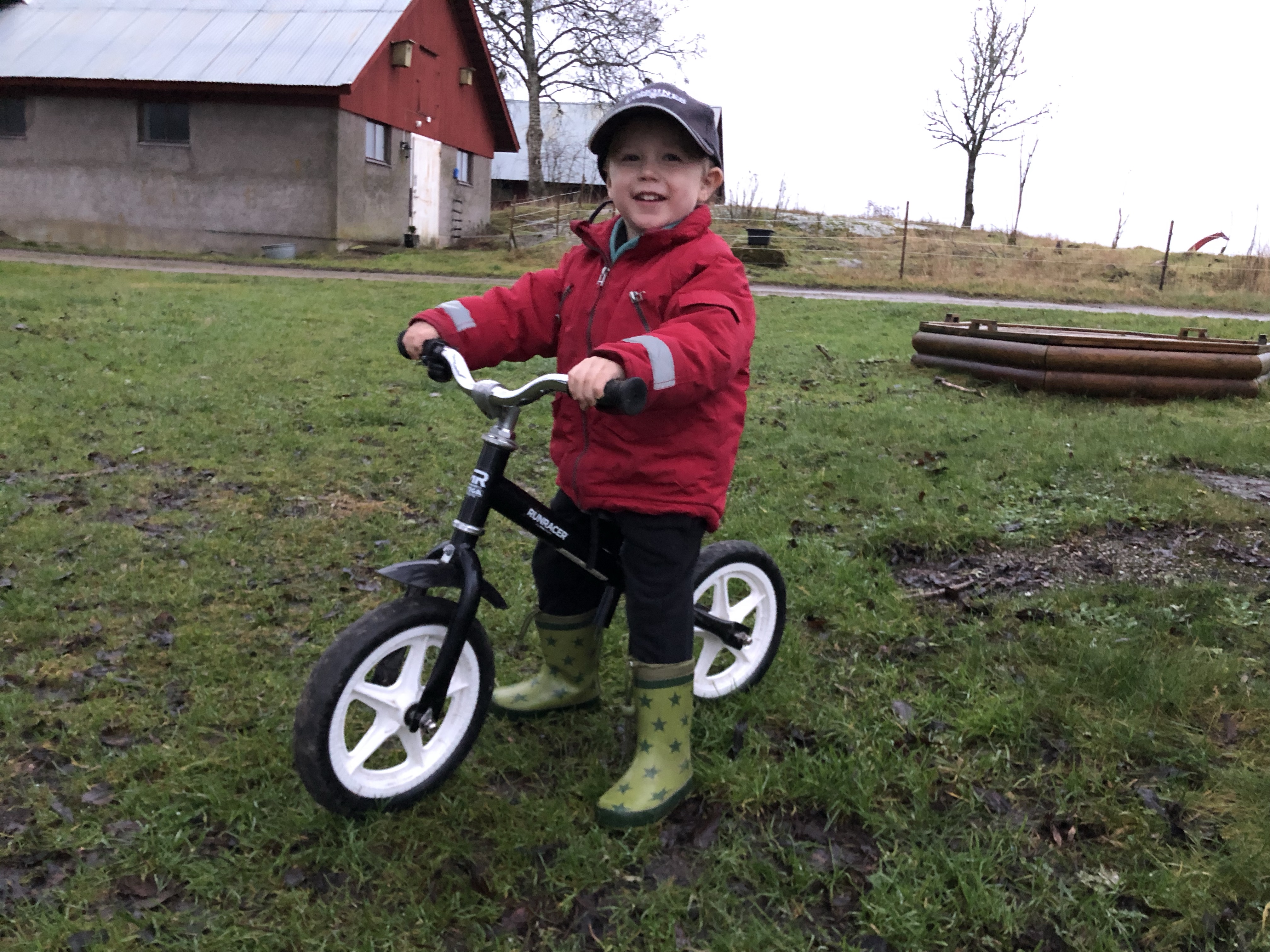 Här är nåt annat som han lyckats med idag också. Äntligen är springcykeln i rätt storlek och Loke tog sina första vingliga steg. Snart går det undan här tror jag! (Och mamman ska lägga fram hjälmen).