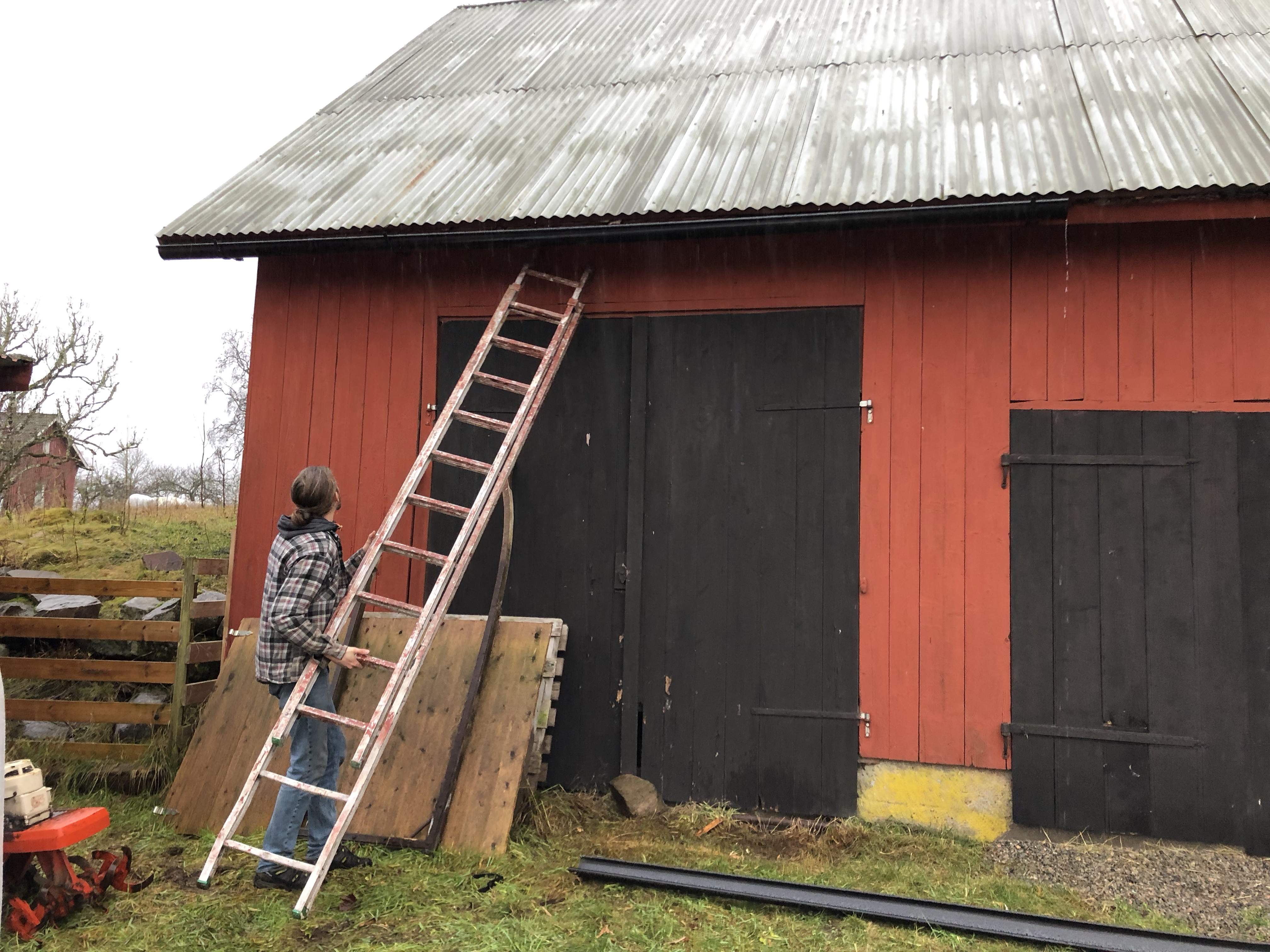 När detta bar klart blev det lunch och Nora sov gott i nestet när det var dags för Lokes sova-promenad så Axel stannade inne med henne och jag gick iväg med Loke. Han somnade nästan direkt så jag kunde snart vända hem. Vi stoppade ner en fortsatt sovande Nora i den andra vagnen och gick ut till stallet. Axel rensade hängrännan som det var stopp i så den slapp svämma över och jag plockade fram material till nästa ”projekt”. Vi har nämligen fortfarande ett par hängrännor liggande så vi tänkte sätta upp dem över fårhuset. Där är det ju faktiskt målat så då håller det sig ju fint lite längre plus att vi leder bort vattnet lite.