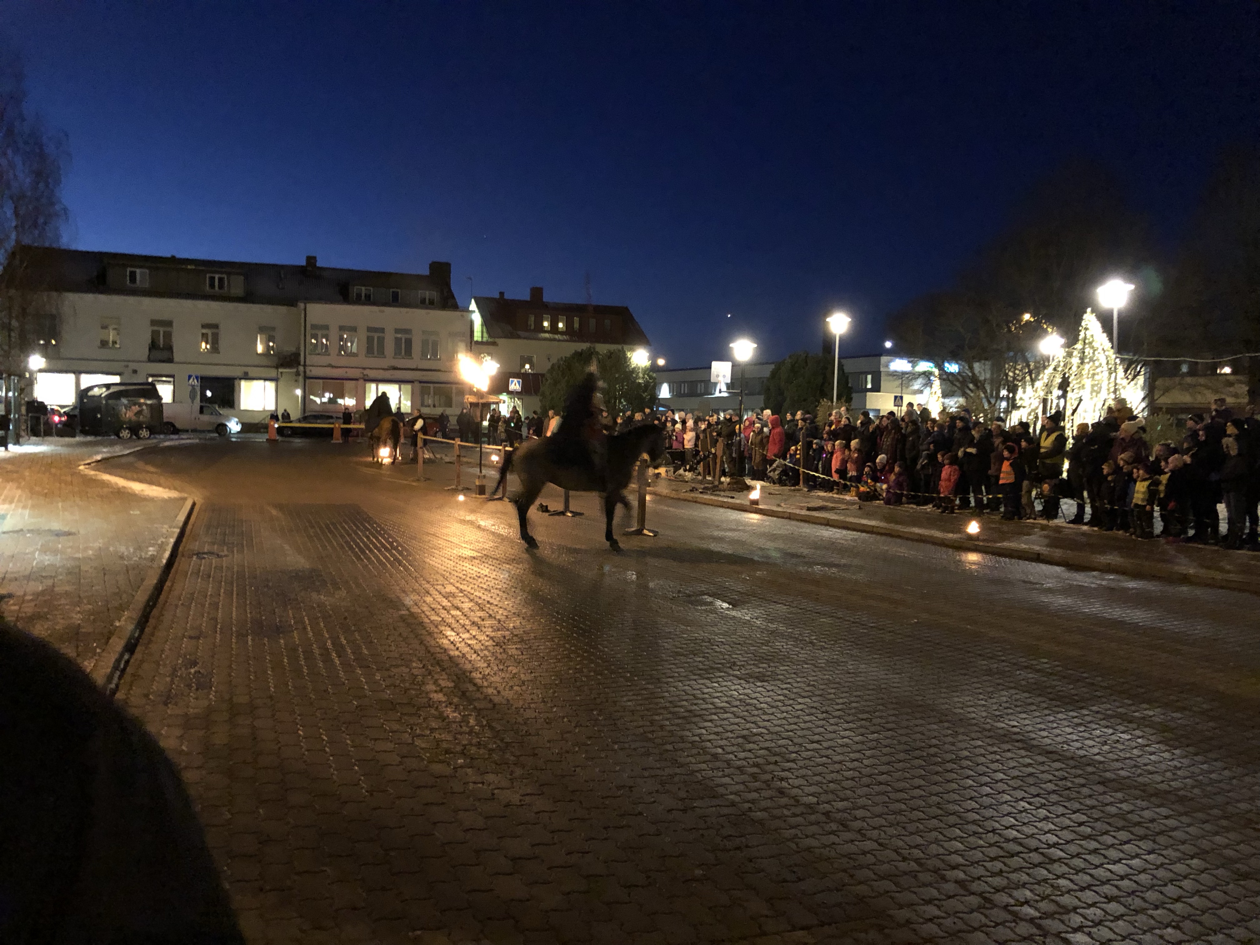 På eftermiddagen åkte vi och handlade och såg en liten ”julshow” vid busstationen i form av tändning av julbelysning och ”eldshow”. Det var två riddare med hästar som gjorde lite trix med bland annat gasfyllda ballonger som exploderade tjusigt när de punkterades av en brinnande lans. Det var även en man, typ ”en eldsprutare” som gjorde lite tjusiga trix med brinnande stavar etc. Loke verkade tycka en del av det var spännande och de var helt klart duktigs!