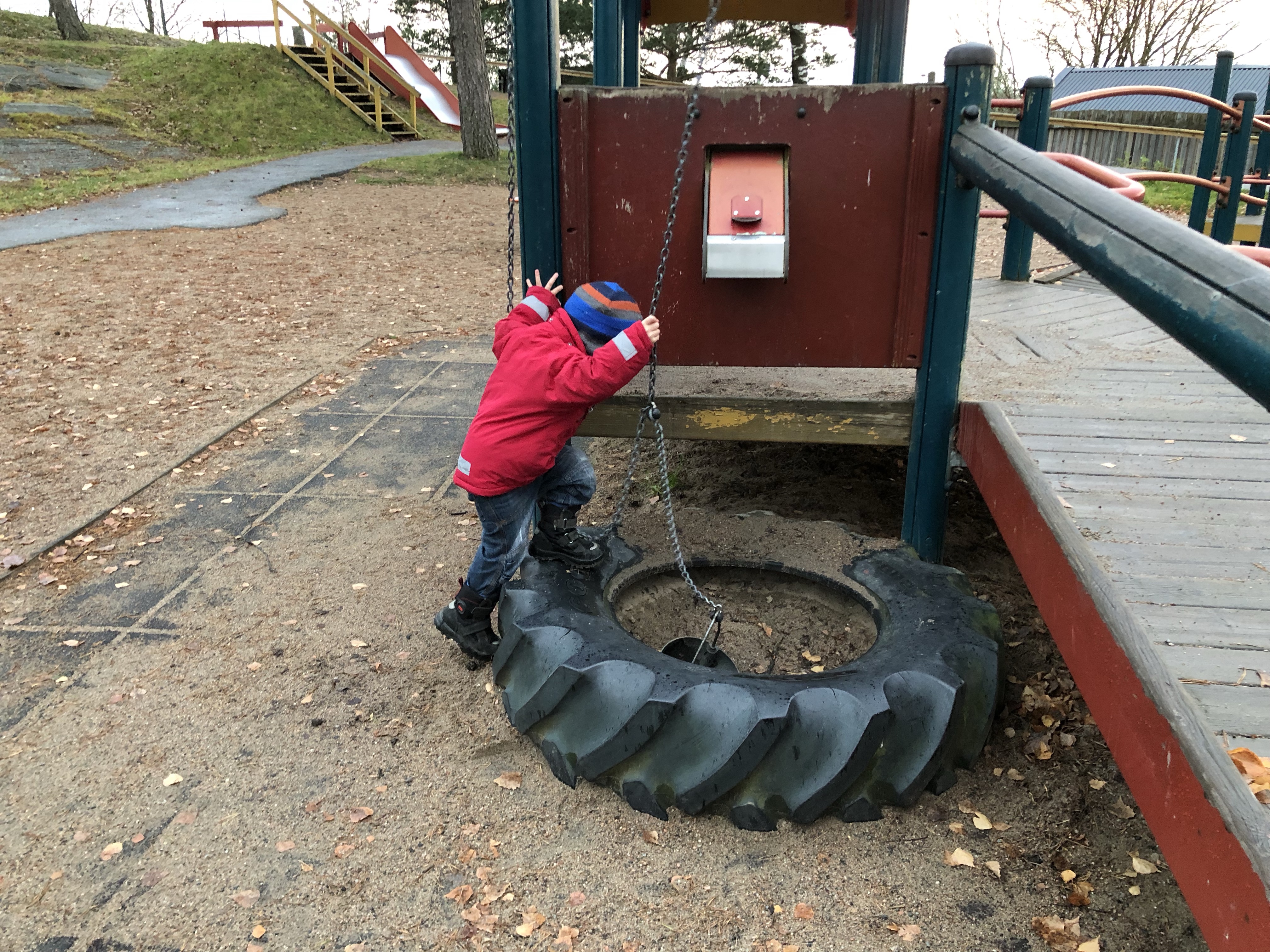 När vi kom hem var det lagom att hämta Loke på förskolan så det gjorde vi, och efter hans tupplur hann vi leka lite hemma innan vi packade in oss i bilen igen. Skodan skulle nämligen på ”felsökning” på verkstan för det där ljudet höger bak. När vi ändå skulle in till Vårgårda åkte jag in en knapp timme tidigare så Loke fick leka lite på en lekplats först.