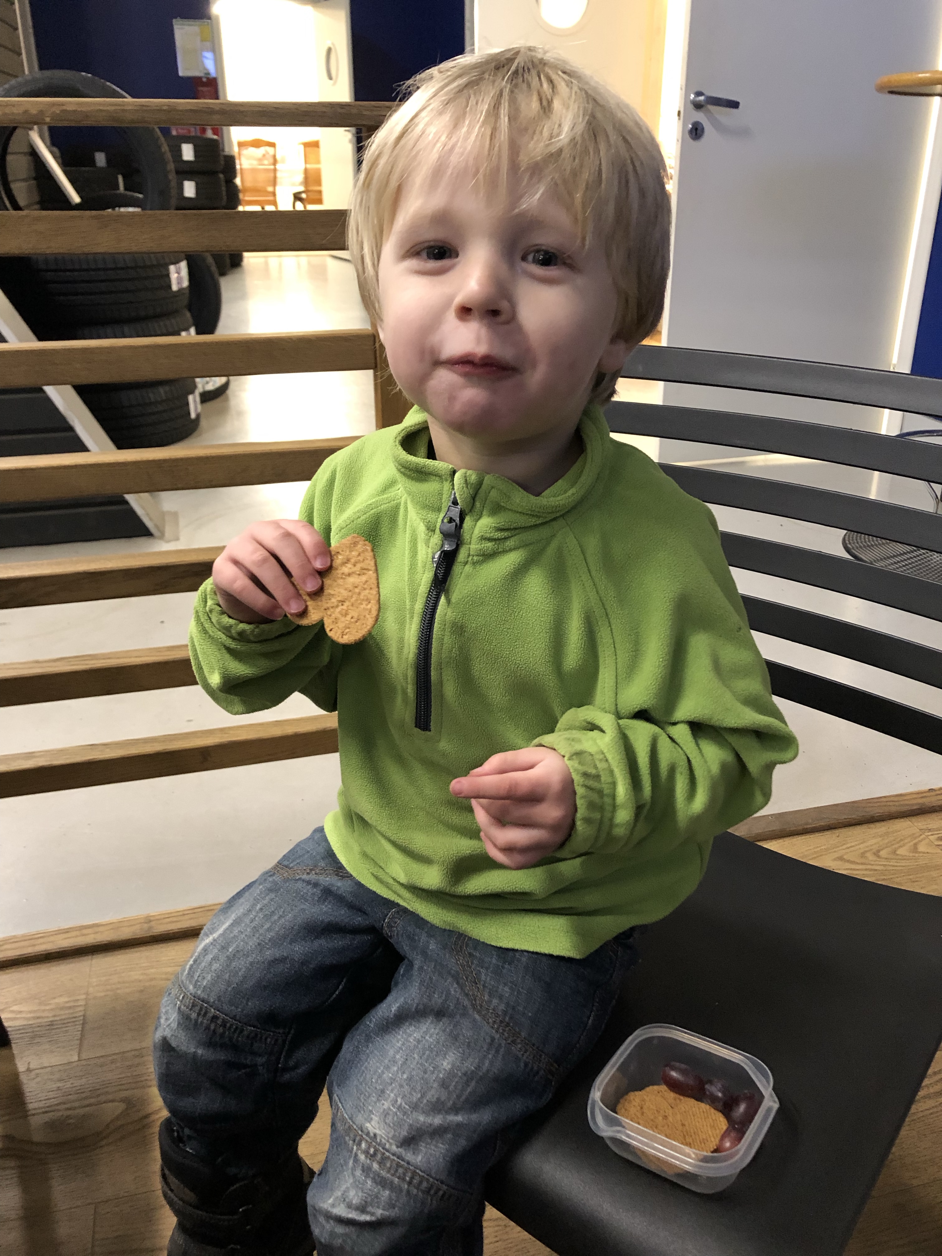 Strax före fyra hoppade vi in i bilen igen och körde till verkstan. De skulle kolla på bilen medan vi väntade så jag hade laddat upp med lite ”fika” som vi åt under tiden. Loke knaprade långsamt på sina två pepparkakor och åt sina sex vindruvor medan verkstan gjorde sitt!