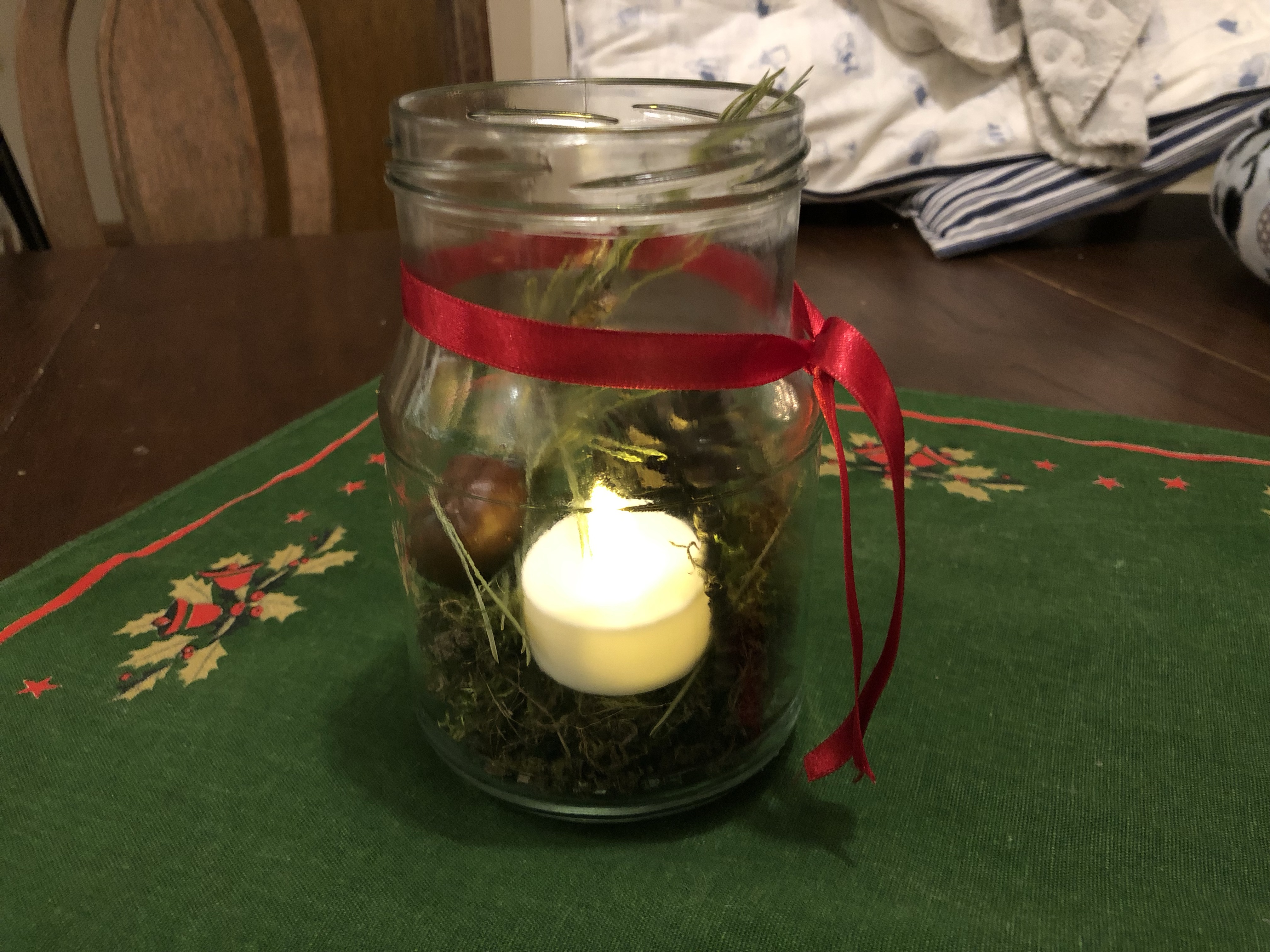 En fin ljuslykta fick vi med oss hem, Loke har skapat! Den innehåller mossa, en kotte, en kastanj och en tallbarrskvist. Och ett batteridrivet ljus.
