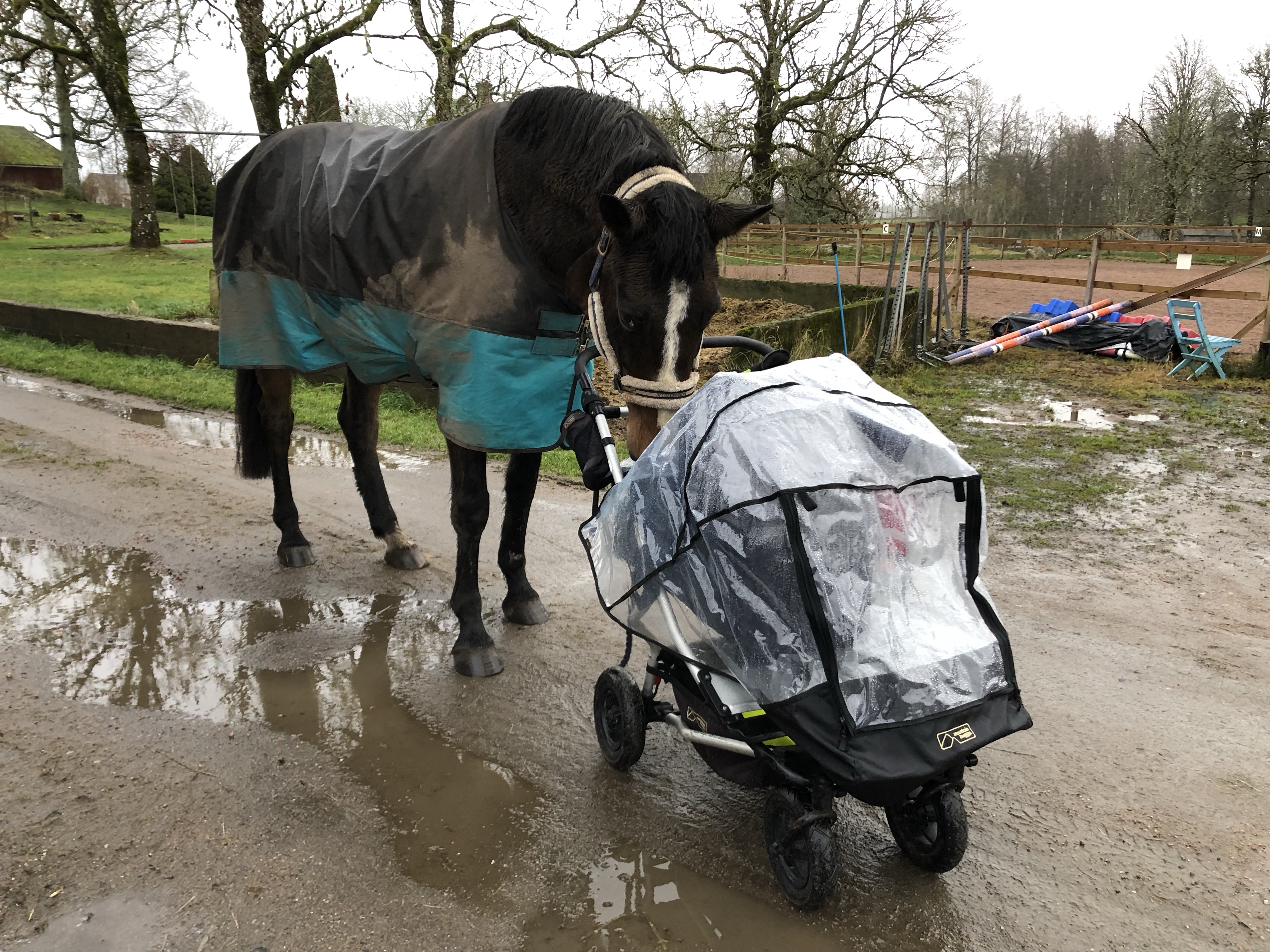 När de åkt åt jag lite lunch och så stoppade jag ner Nora i vagnen och hämtade Loke på förskolan igen. Vi gick direkt hem och hämtade Kaprifol som fick hänga med på promenad. Två sovande barn i vagnen och hästen på släp, plus lite motion för egen del. Många flugor i den smällen!