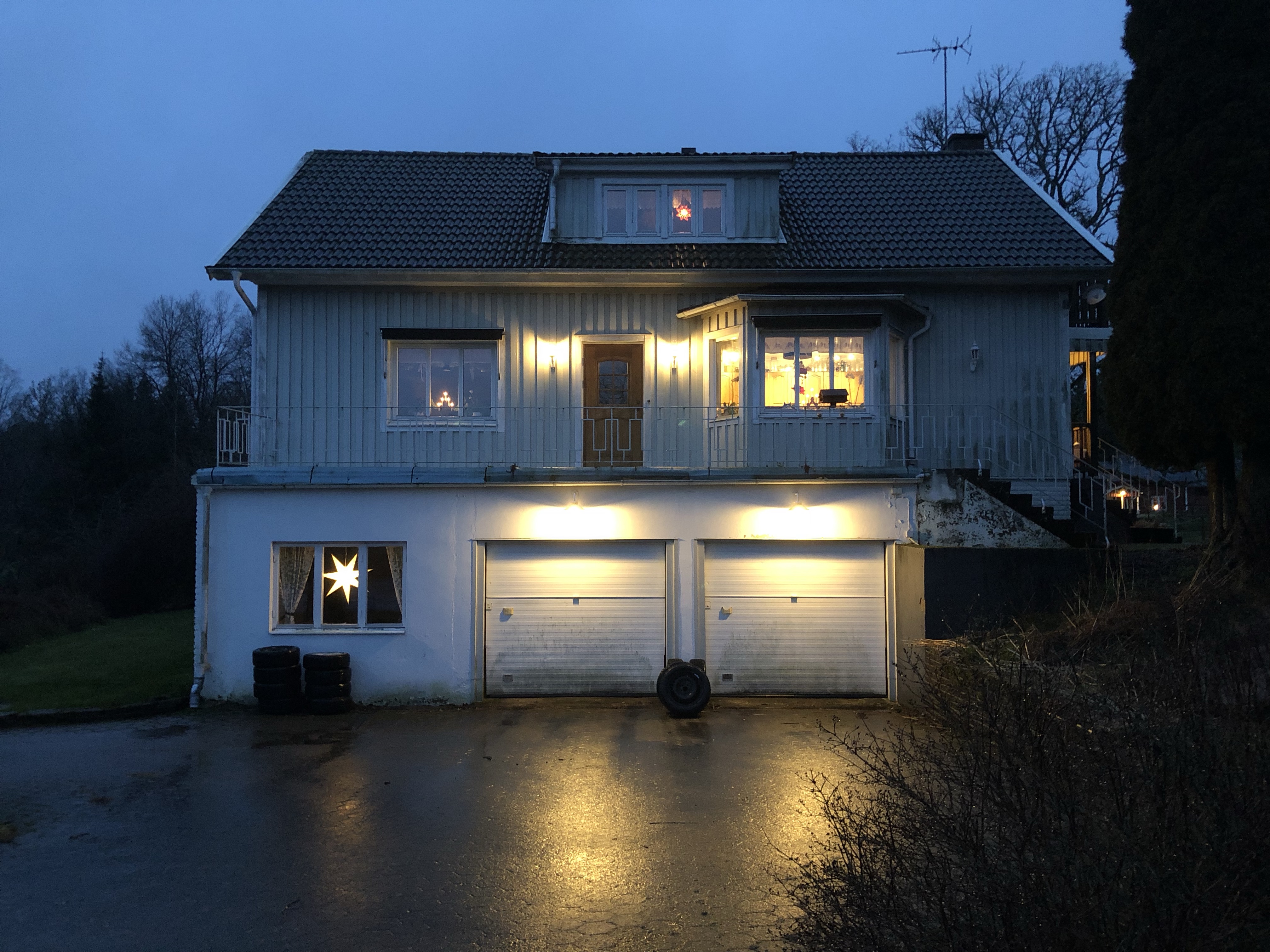 Vårt eget hus får pryda med bild, när det är lite mörkt ute ser man inte riktigt hur nedgången fasaden är, hehe. Får se om det kan tänkas bli sommarens projekt, börjar bli dags att huset får lite yttre kärlek.