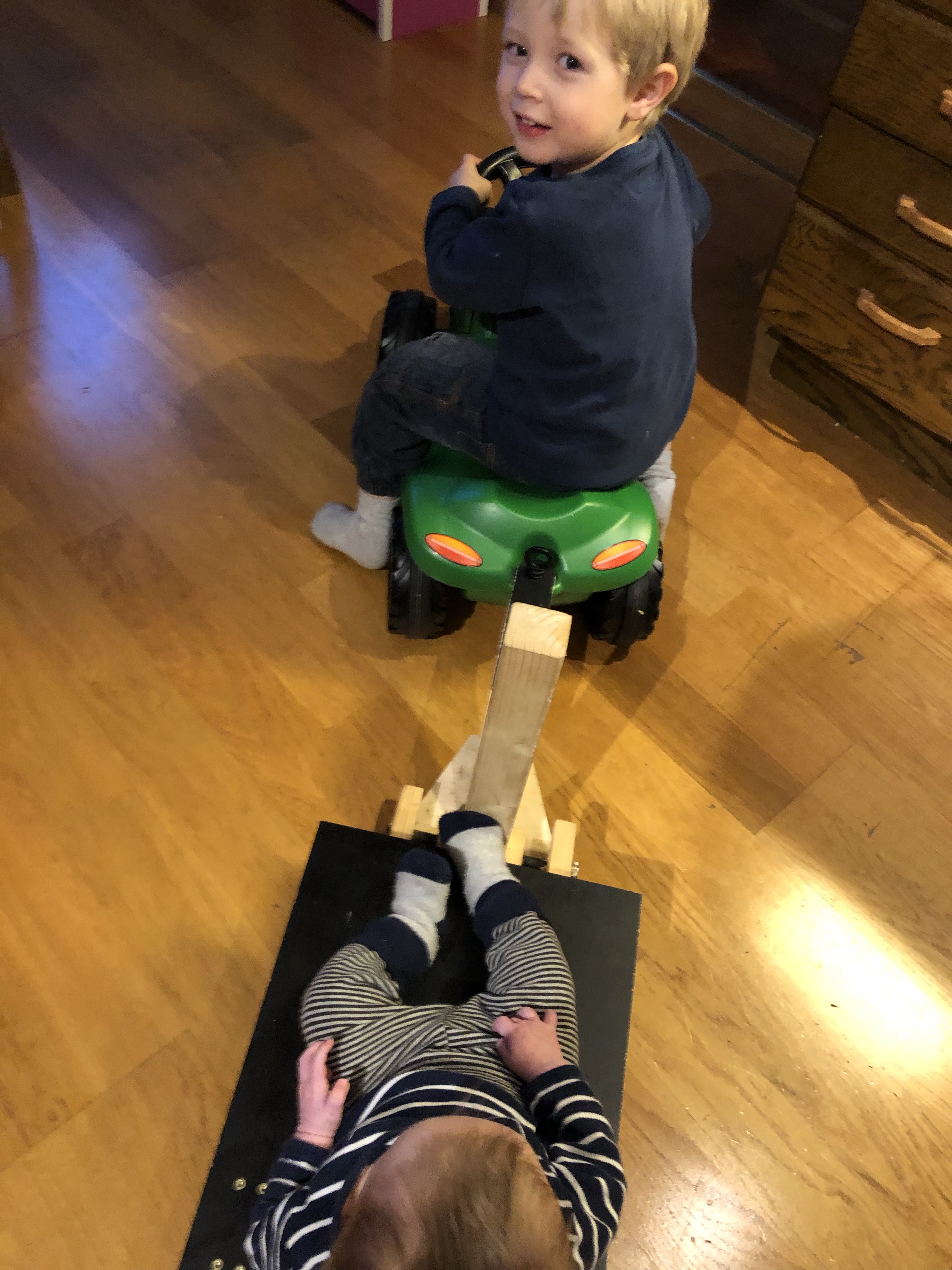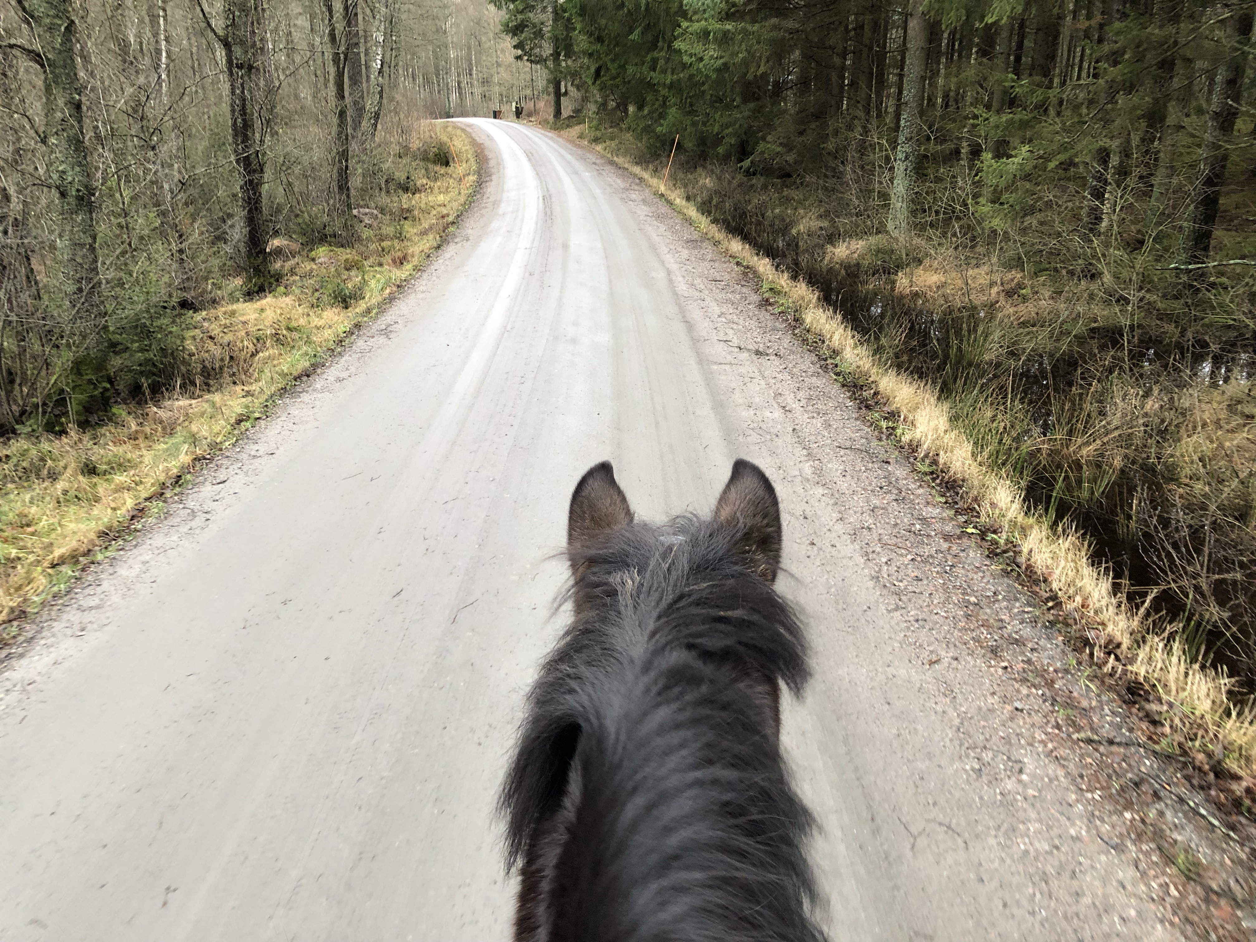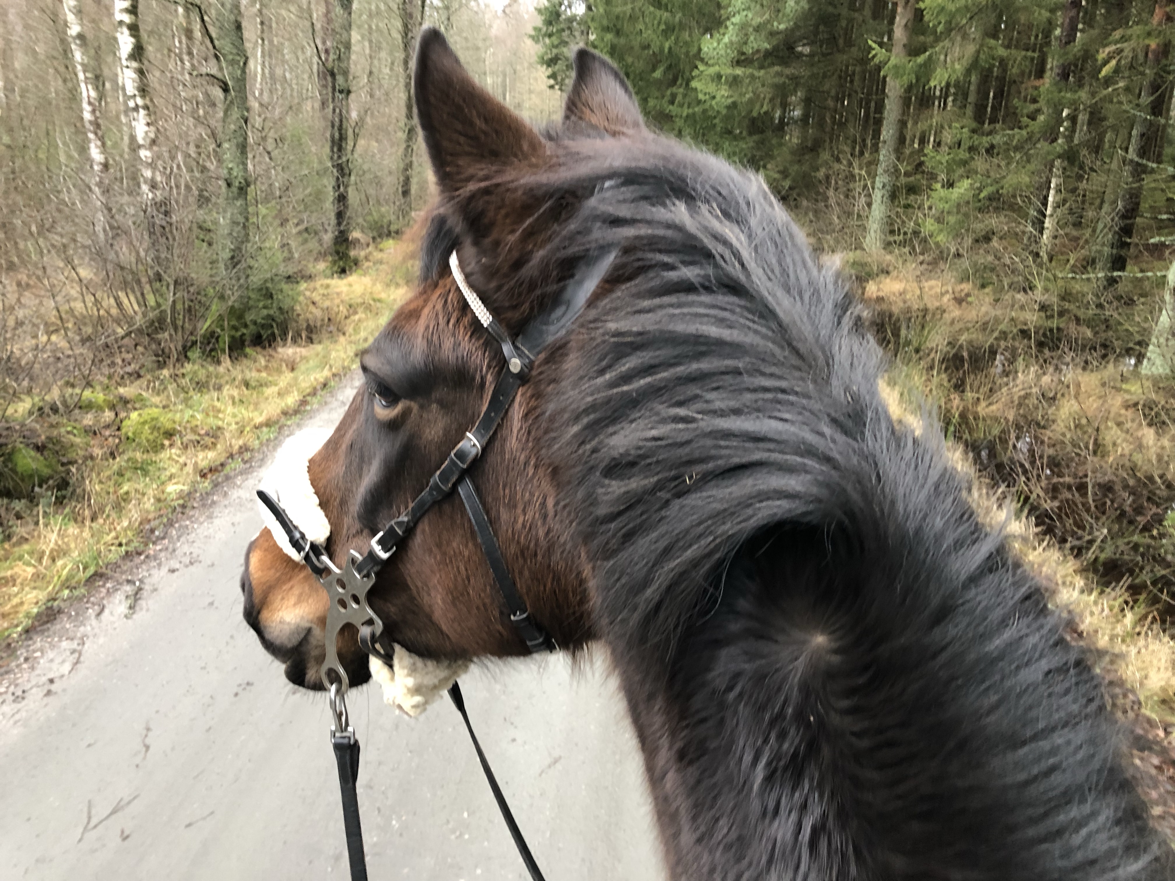Efter trippen till Od blev det lite frukt och sen körde vi ved och mockade lösdriften. Lunch intogs och sen gick vi ut på promenad; jag red Kaprifol och eftersom vi har fått punktering på syskonvagnen fick Nora åka sele och Loke vagn. Det blev rundan via badplatsen och efter drygt halva vägen sov Loke gott i vagnen. Kaprifol kändes pigg och glad!