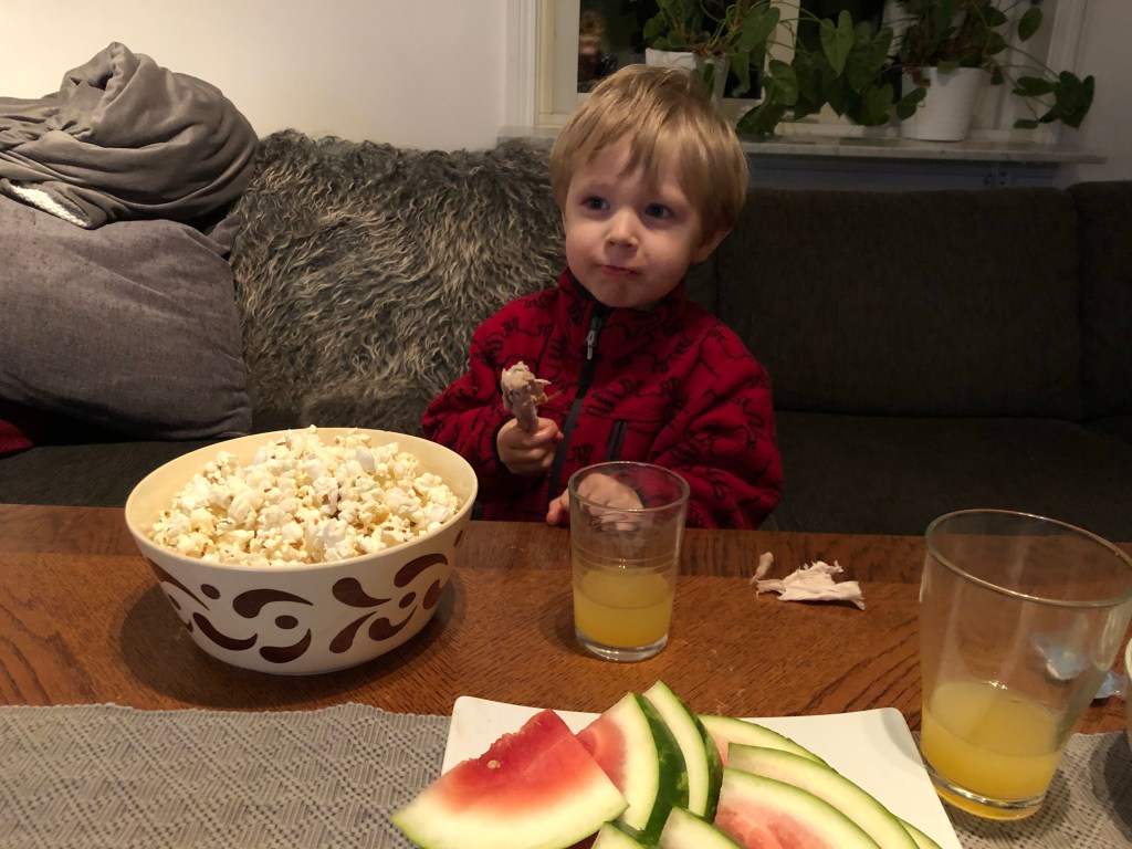 Vid tolv åkte vi den lite dryga timmen till Gullspång och åt pizza hemma hos mormor. Loke blev lite avrastad och Nora fick sträcka på sig! Sen åkte vi till Ica i Vårgårda och handlade mat och massa gott till fredagsmys. Kvällen avslutades därmed i soffan med Pippi på tv och grillad kyckling, melon, vindruvor, choklad och popcorn. Loke åt förvånansvärt mycket kyckling med alla godsaker framför ögonen!
