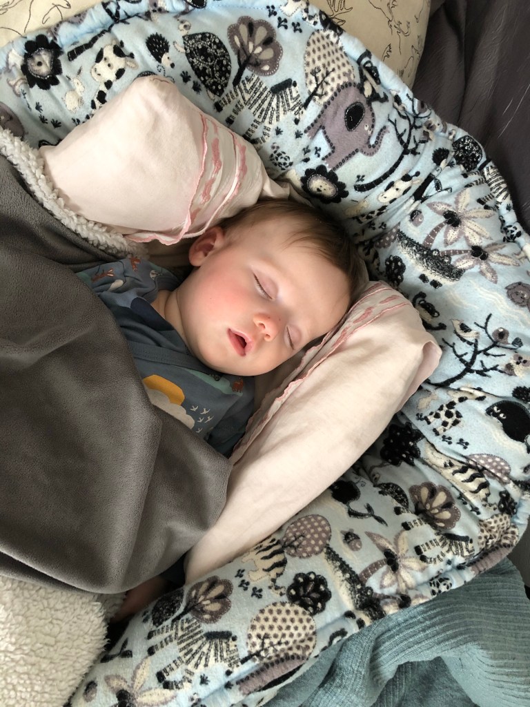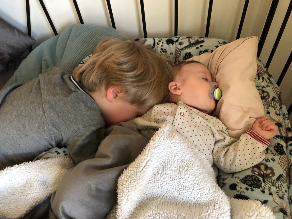 Nora sov gott i sitt nest och Loke hade krupit upp intill henne och somnat han med. Storebror tycker allt om sin lillasyster.