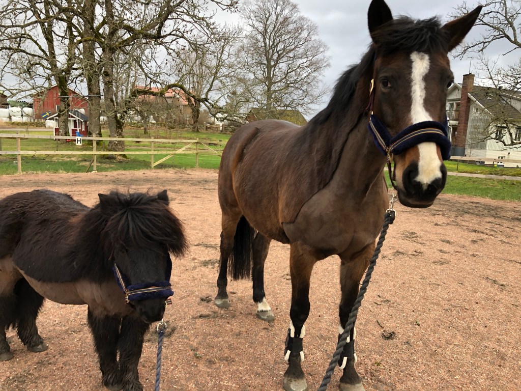 När vi var tillbaka vid stallet red jag in på banan och lyckades stänga grinden och knäppa loss Nasses grimskaft utan att hoppa av. Och så blev det lite dressyrat för Kaprifols del, som kändes fin!! Nasse var dock inte helt hjälpsam för han förföljde oss stundtals och gjorde små ”utfall” mot oss och efter oss så både jag och Kaprifol var lite splittrad i koncentrationen. Lite osäker på om han var busig eller om han tyckte jag var elak som inte släppte tillbaka honom i hagen igen? Till sist ”gav jag upp” och tog av sadel och träns från Kaprifol och lät båda hästarna vara lösa. Med lite viftande med ett grimskaft fräste båda hästarna iväg i galopp och bockade och busade båda två, så kanske var han lite busig ändå den lilla svarta. De fick fräsa runt en stund och ha roligt och sen tränade jag lite ”inkallning” på de båda och skrittade av dem. Söta var de i alla fall, men nästa dressyrpass får nog bli utan Nasse!