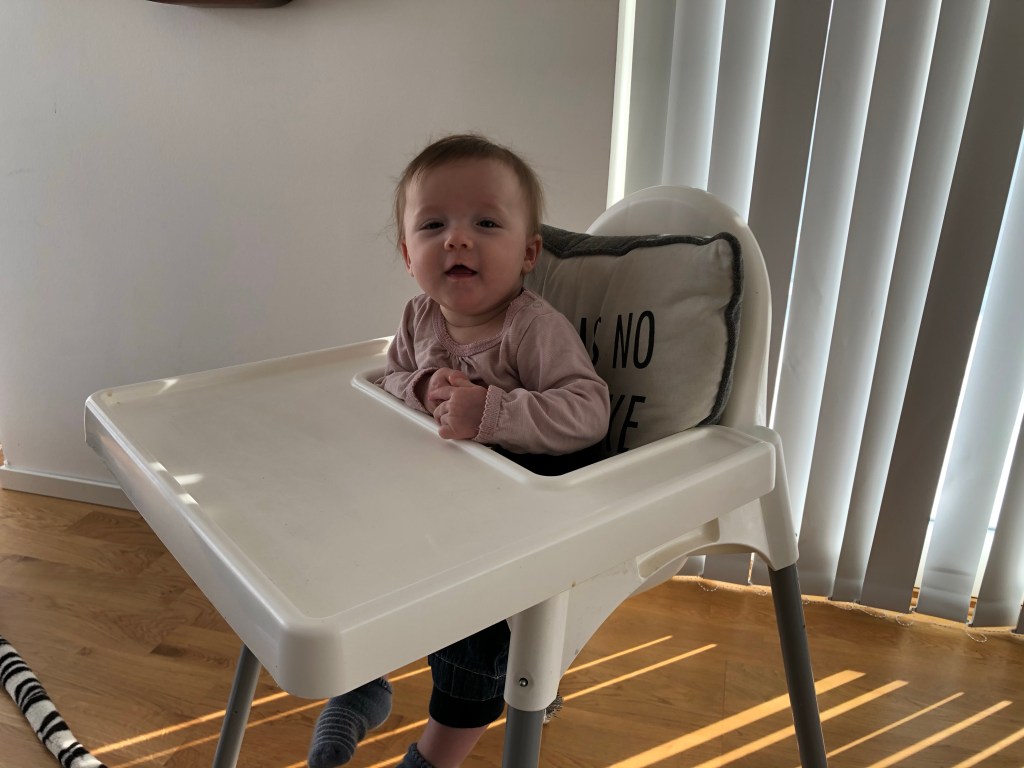 Vi hälsade på deras gosiga hundvalp och fikade på mumsig morotstårta. Nora satt fint i barnstol!