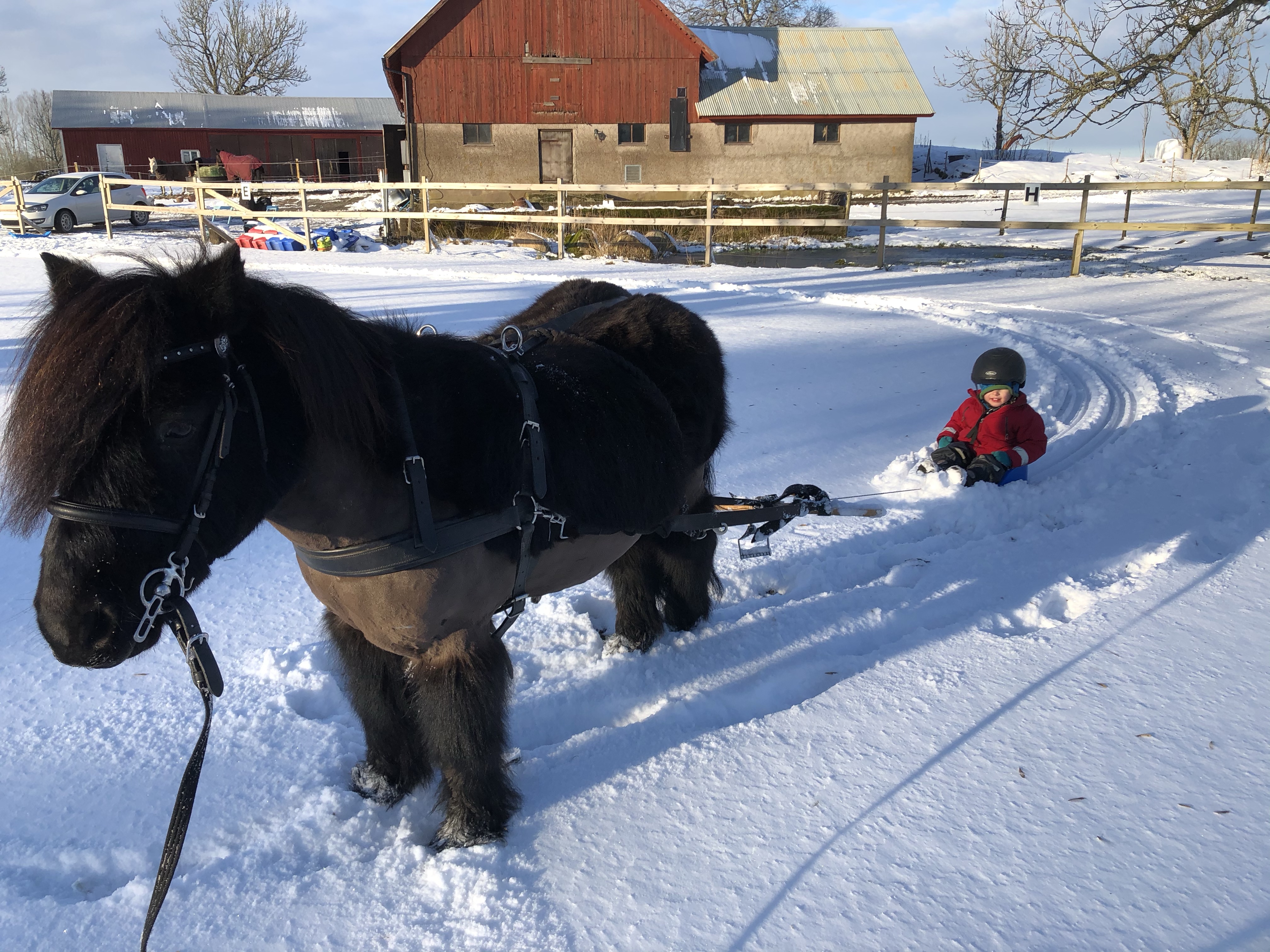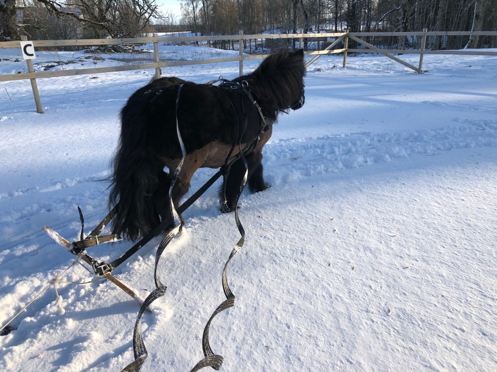 Duktig liten ponny i alla fall som drog på fint! Några steg i trav blev det också men Loke tyckte att det var lite läskigt tror jag, alternativt att han fick snö på sig. Får se om det blir nåt mer tillfälle innan snön försvinner igen.