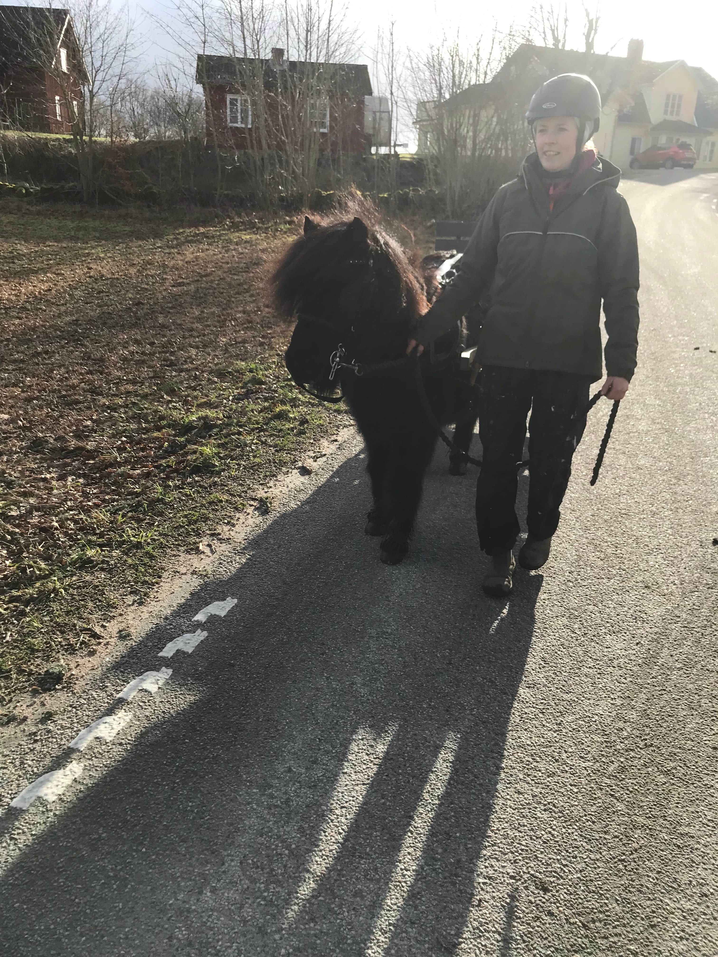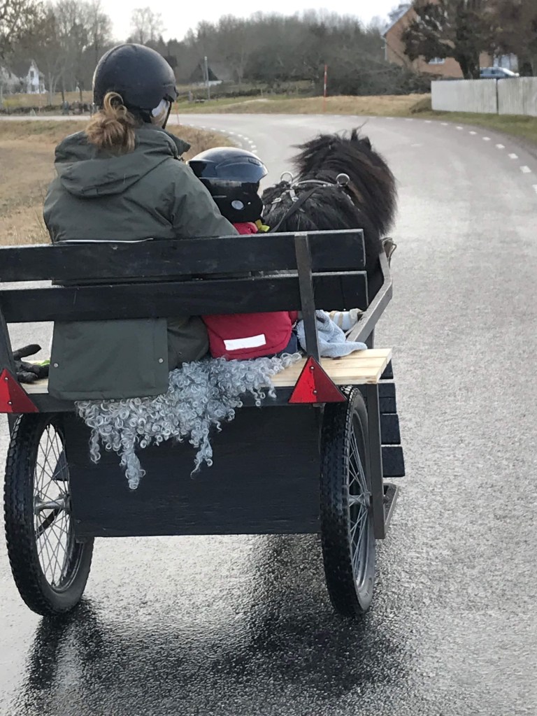 Mamma höll ponny och barnvagn medan jag hämtade Loke, och så fick Loke hoppa upp i vagnen bredvid mig. Och så åkte vi hem! Nasse fattade direkt att vi skulle hem och skrittade på så fort han kunde, kanske lite ängslig ändå i sitt nya liv.