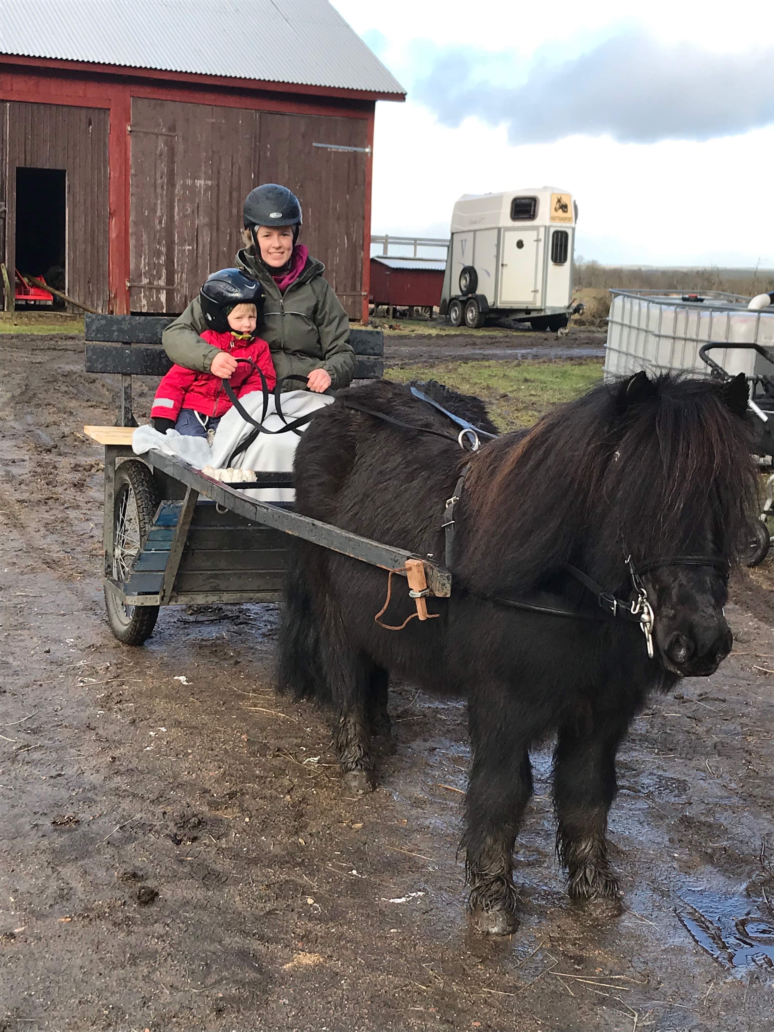 Mina draglinor var ju dock alldeles för långa så det får jag införskaffa, men det går ju att köra lite ändå även om åkturen för både häst och passagerare är behagligare med dessa. Så efter lunch fick Assim komma in och bli borstad och påselad, och så spände vi för honom för vagnen. Här skulle Loke hämtad på förskolan i häst och vagn! En liten dröm jag haft i flera flera år faktiskt. Urpsrungligen skulle det ju såklart vara Alice som skulle dra vagnen, men det hann vi ju inte tyvärr. Men Assim klarade det alldeles utmärkt!