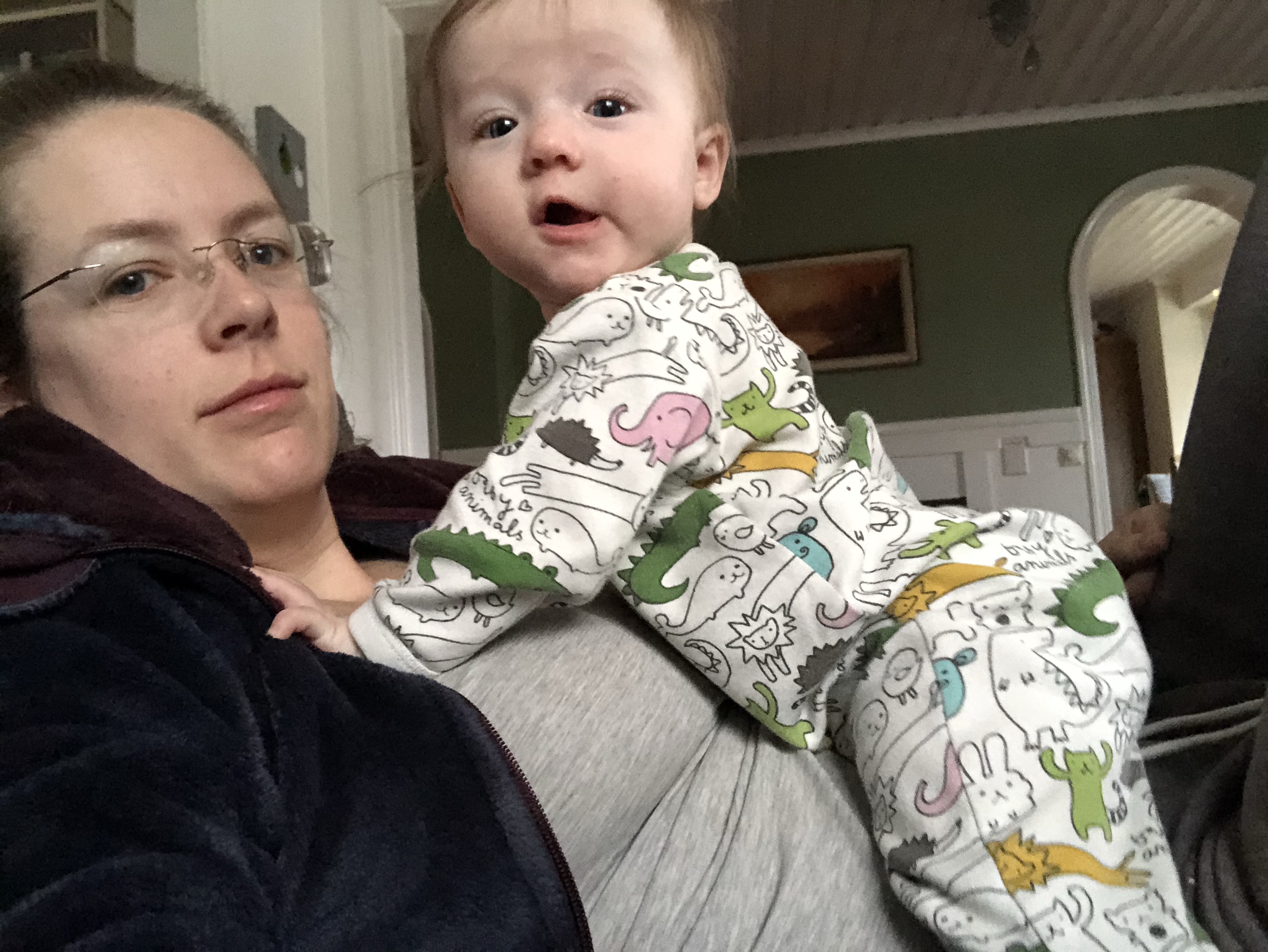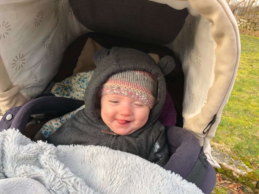Nora sov gott på ryggen så jag la ner henne i vagnen så jag och Loke kunde greja lite mer obehindrat. Vi mockade lösdriften och fyllde på spån och donade. Och ”kvällade” djuren innan vi kände oss klara. Kvart över fyra var klockan då! Nora vaknade precis när vi var klara, bra tajming!
