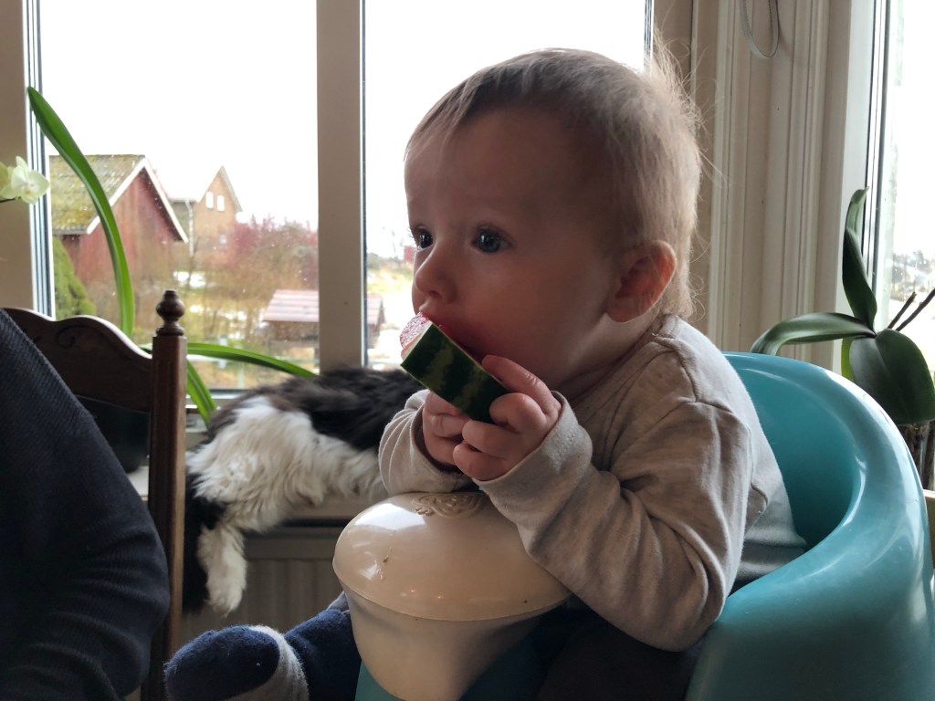 Nora har ju sen två veckor tillbaka fyllt fyra månader och får numera smaka på annat än bröstmjölk och ersättning. Det gör hon med förtjusning helt klart. Med Loke minns jag att jag gjorde små ”smakportioner” med mixade majs, ärtor, potatis mm. Men detta är ju andra barnet så sånt orkar vi inte med utan hon får smaka på det vi äter helt enkelt. Potatismos och vattenmelon är favoriterna hittills. Korv stroganoff var inte dumt heller. Här ser det ut som att hon kan äta själv också! Men det är hon såklart inte så bra på ännu.