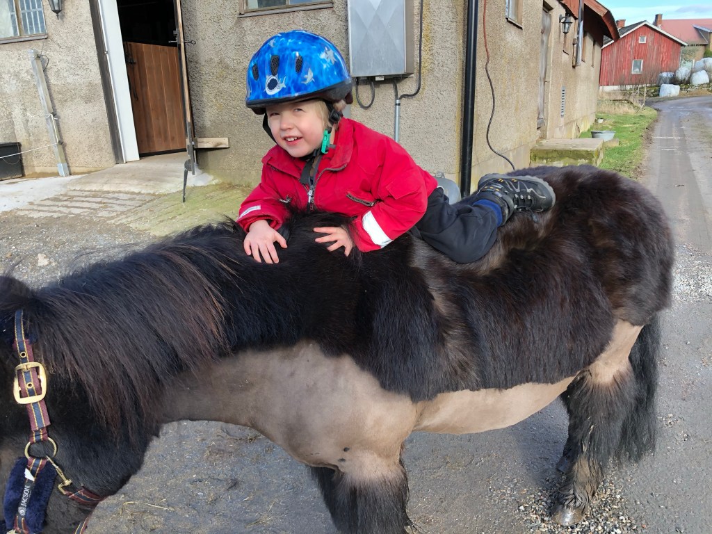 Loke hämtades sen på förskolan och vi mellanlandade inne en stund innan vi gick ut igen. Nu fick Nora sitta på min rygg och Loke på Assims. Utan sadel ville han rida idag, så det fick ju bli så. Vi gick lite i sommarhagen och sen rundan runt hagarna så det blev kanske nästan två kilometer promenad. Assim skötte sig lika bra som alltid, kan bli lite mer spännande när gräset börjar spira lite mer. Vi får se.