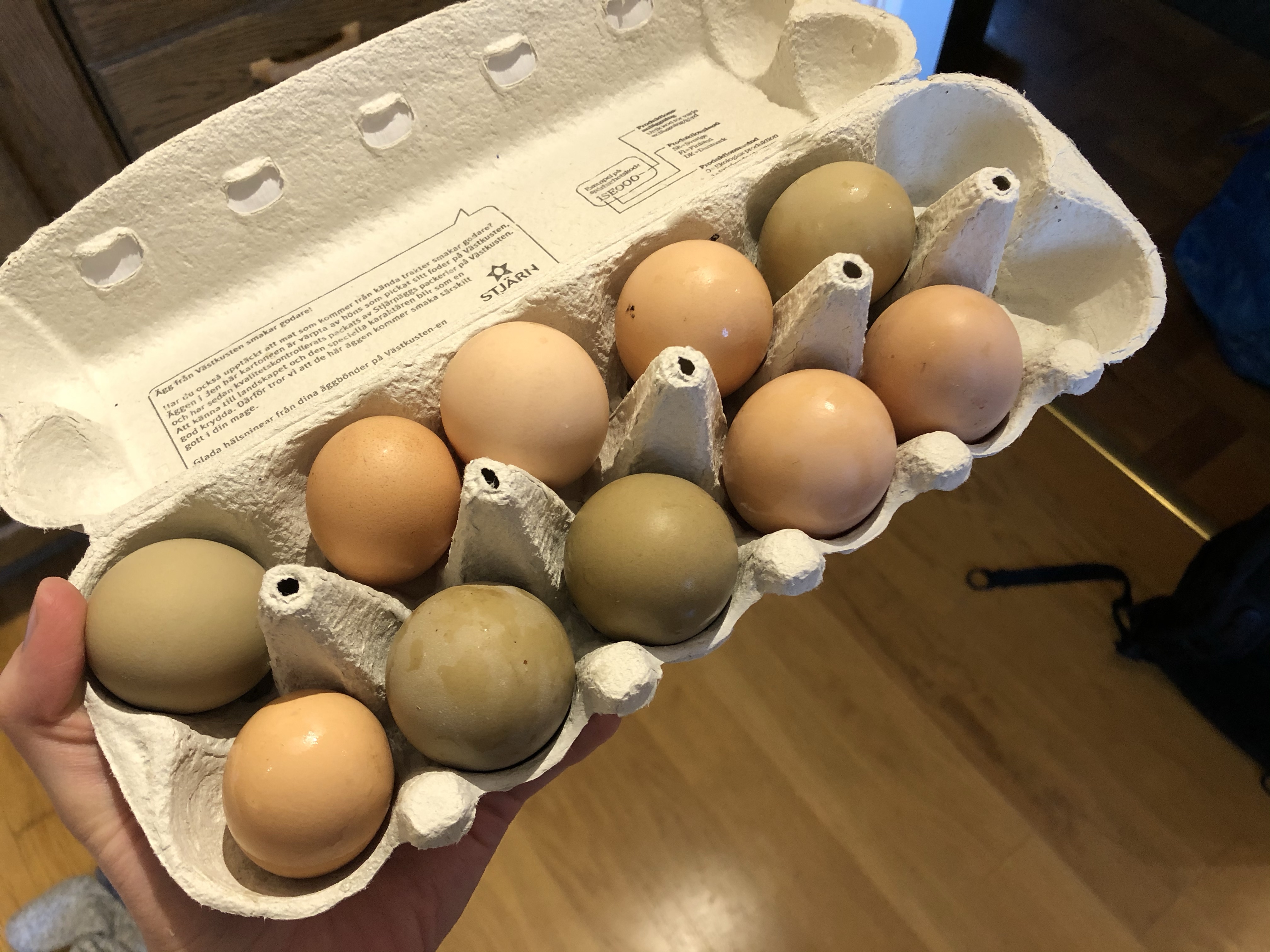Fem ägg fick vi med oss in! Håller redan på att fylla förrådet efter att ha ätit upp de flesta i helgen. Fin palett på äggen är det också.