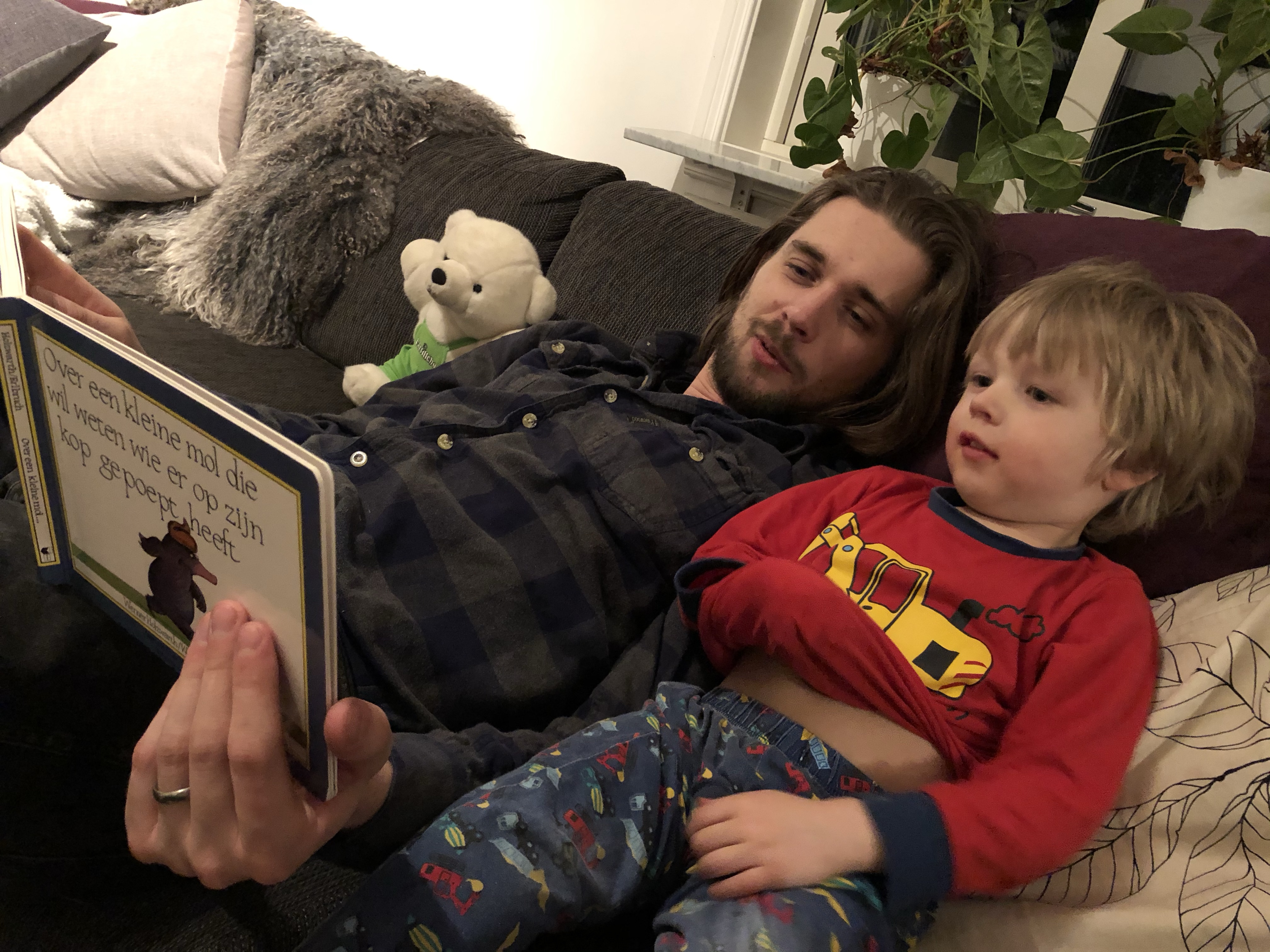 Axel har en student från USA på besök på jobbet denna vecka (och han bor hos oss ons-fre) så han jobbade sent idag. Och gissningsvis resten av veckan också. Men han hann läsa en bok i soffan innan det var läggdags för Loke.