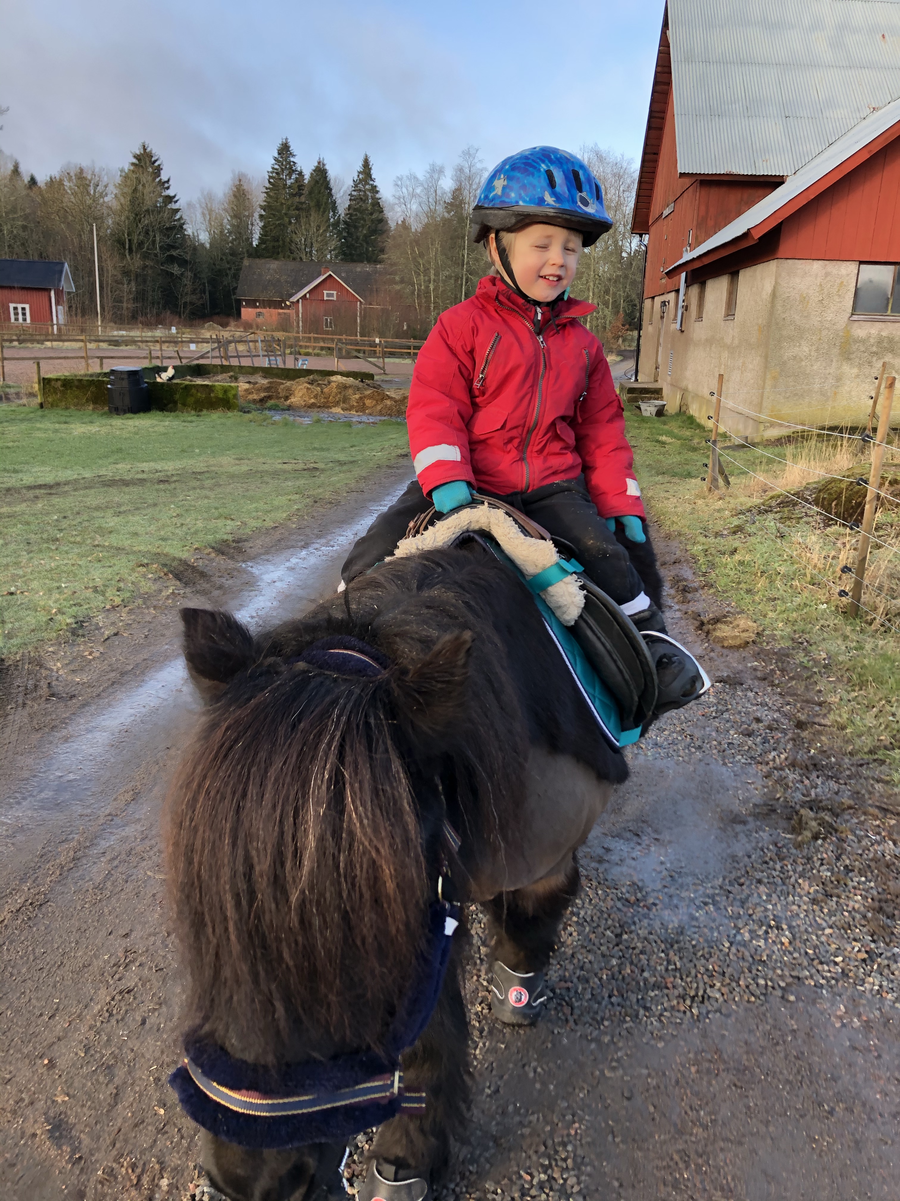 Ja dagens ”stora” happening gick av stapeln efter frukost och morgonbestyren. Vi hade packat en liten väska med frukt och nyponsoppa och så tog vi in Assim i stallet och sadlade honom. Loke hoppade upp på sin svarta springare och så gav vi oss iväg!