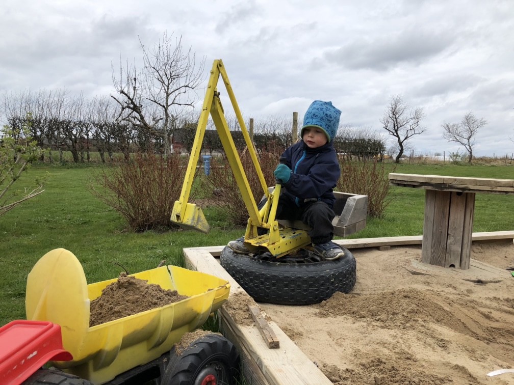 Loke och Thor lekte jättebra tillsammans och det fanns många roliga leksaker i deras trädgård. Gungor, en tramptraktor, barnvagn, sandlåda med många dumprar och så en grävmaskin! Den har Loke sett från vägen när vi gått förbi och länge velat prova. Han lärde sig snabbt hur den funkade!