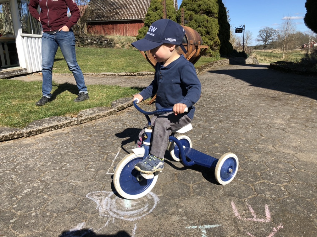 Vid halv elva kom kusin Lucas och Oliver för att leka med oss en stund! Lite ponny och häst blev det också såklart. Loke ”tjatade” hela morgonen om att han ville rida, och han ville ha ridbyxor också! Så det var ju bara att rota fram Elinas gamla ridbyxor i arvegodset, tre nummer för stora men pojken godtog detta utan bekymmer. Lucas och Oliver turades om på den stora hästen.