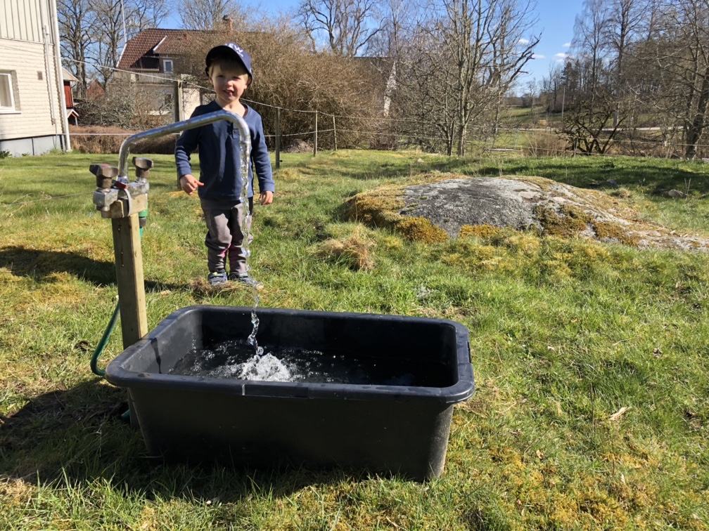 Vi tog det rätt lugnt resten av dagen men gjorde i alla fall en liten vattenstation hos fåren. Den nedgrävda vattenslangen i trädgården lokaliserades och kopplades in i en kran. Tjusigt va! Så kan man bara skruva på vattnet på husväggen och så fylls karet i hagen. Man behöver ju såklart ändå gå in för att göra rent lite då och då men nu är slangen på plats hela tiden så behöver man inte dra den över eller i genom staketet.