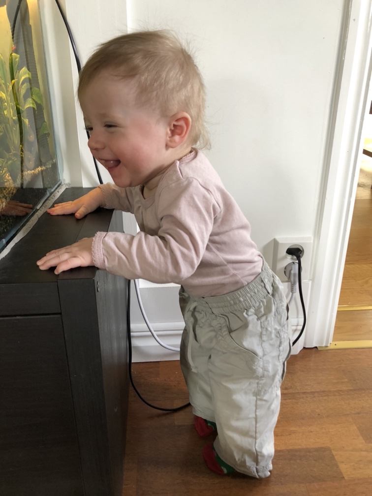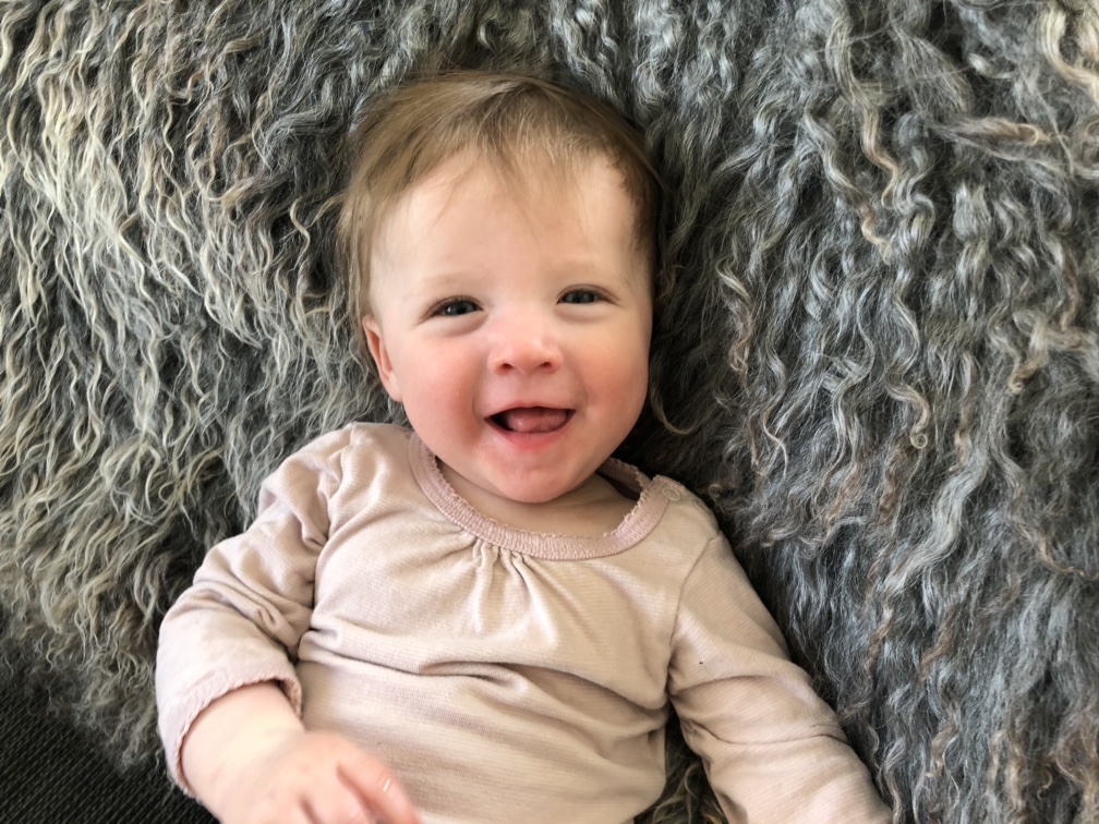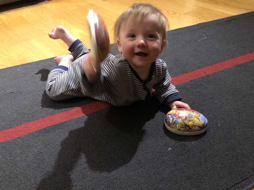 Nora har som sagt sovit mest hela tiden men har varit glad där i mellan. De senaste dagarnas gnällighet har hållit sig borta skönt nog! Den roligaste aktiviteten just nu är att stå upp. Hon är nästan lite målsökande när hon kryper fram, och liksom letar efter grejer att stå upp mot.