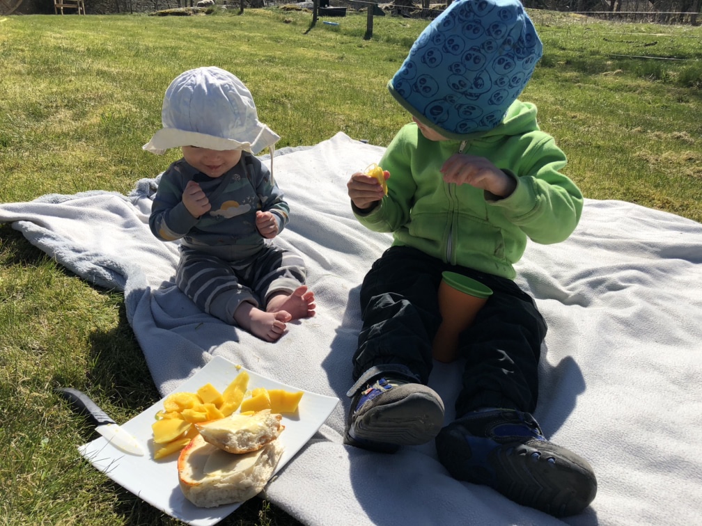 Efter handlingen åt vi frallor och mango på en filt i trädgården.