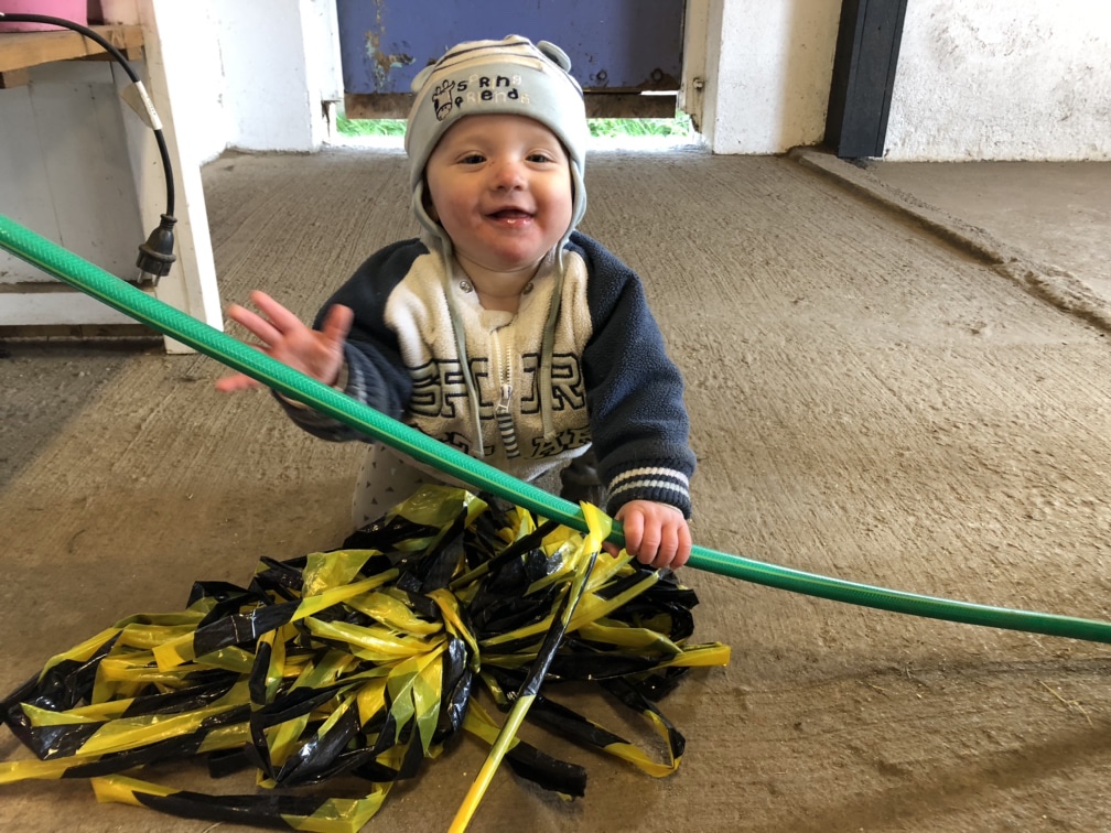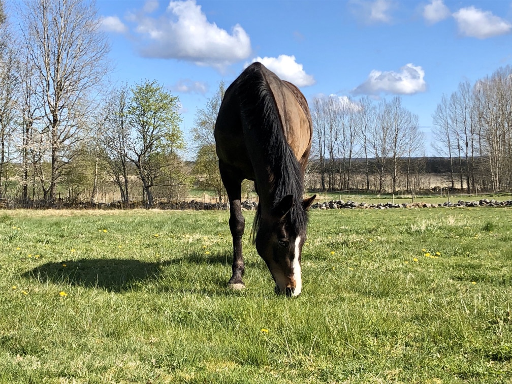 Efter detta satt jag ute i trädgården och pratade med Tilda och Noah en stund innan jag gick in och grejade lite. Sen lunch och hämta Loke på förskolan! Det fick bli hämtning av bil för vi behövde lite vit stängseltråd också, den var slut på Gabbes igår. Och så köpte vi bensin till gräsklipparen så när vi kom hem klippte jag och Loke gräset medan Nora sov. Och efter det hann vi fika en snabbis på glass och banan innan det var dags att ta in hästarna till Hovis-Jonas!